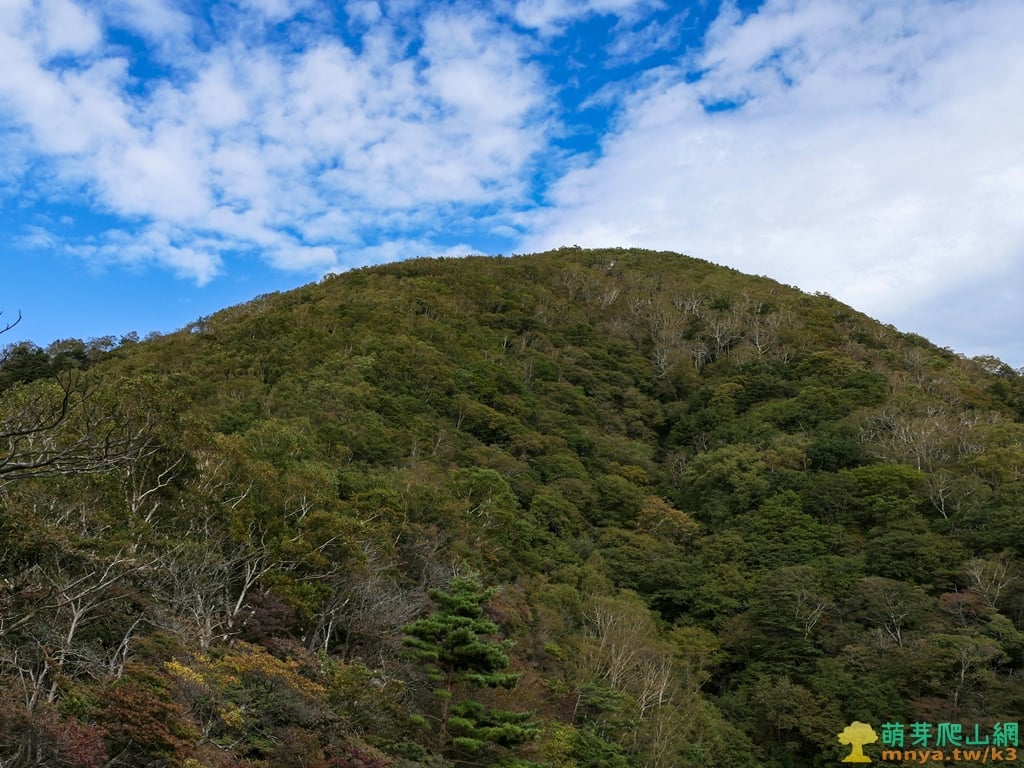 ▲從黒檜山3號防迷標誌、富士山觀景點仰望前方的黒檜山,山勢還相當高聳陡峭,大約還有一半的爬升才能抵達稜線。