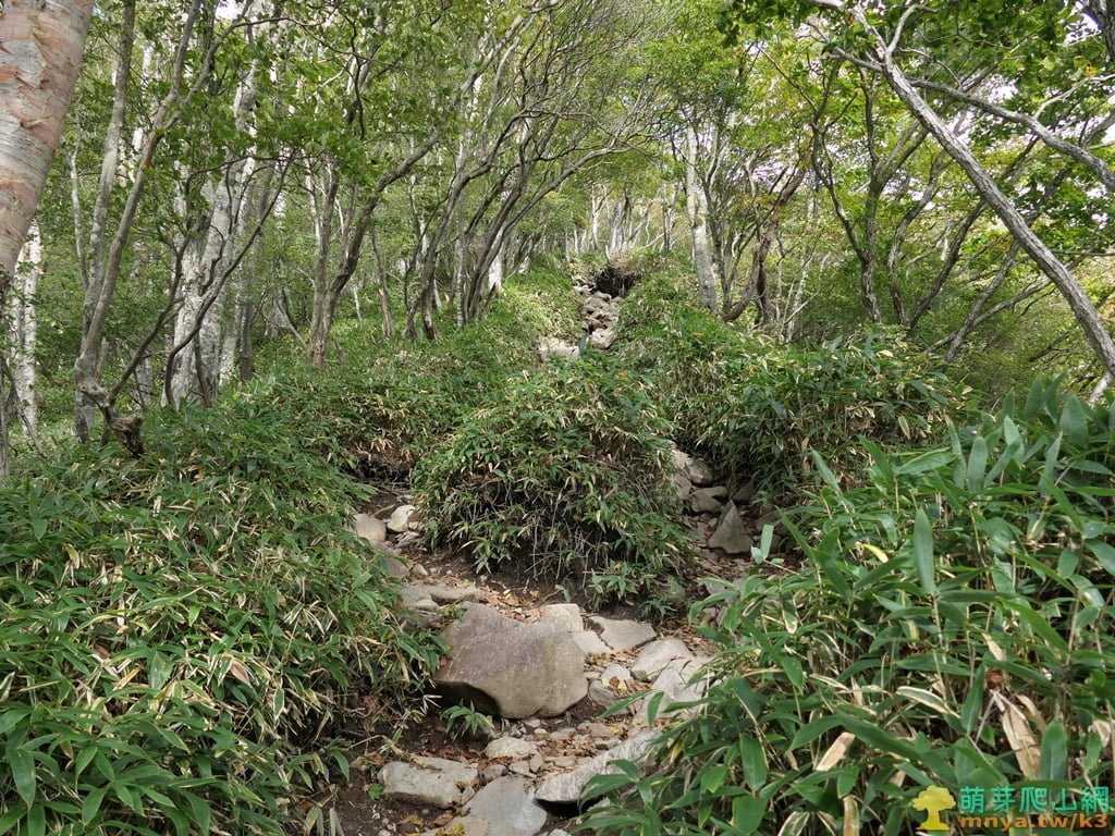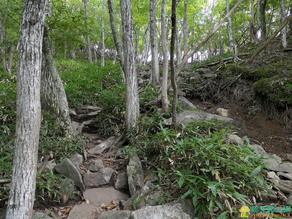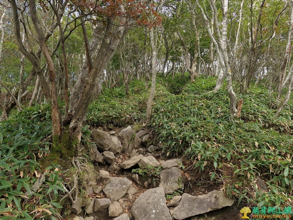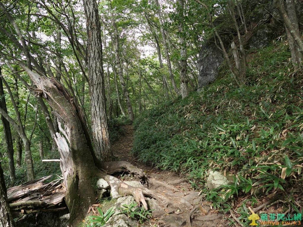 ▲經過猫岩後再一段大陡上坡,與前段一樣靠左側的山坡陡升回支稜,林下路徑有些雜亂。