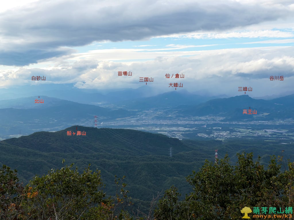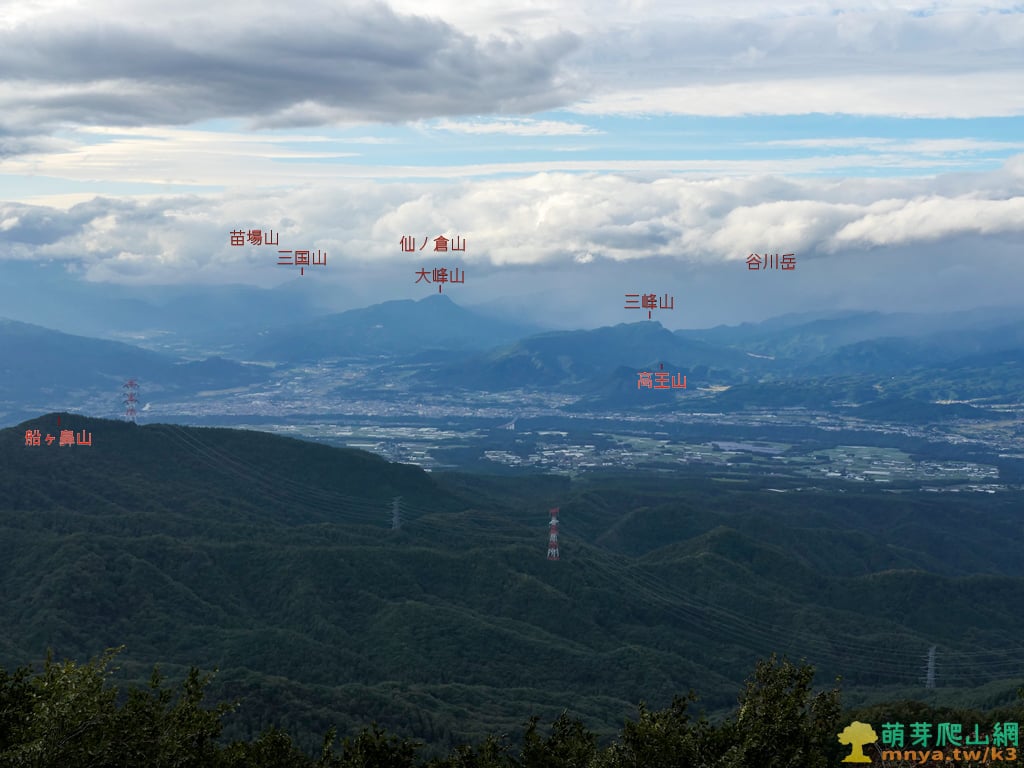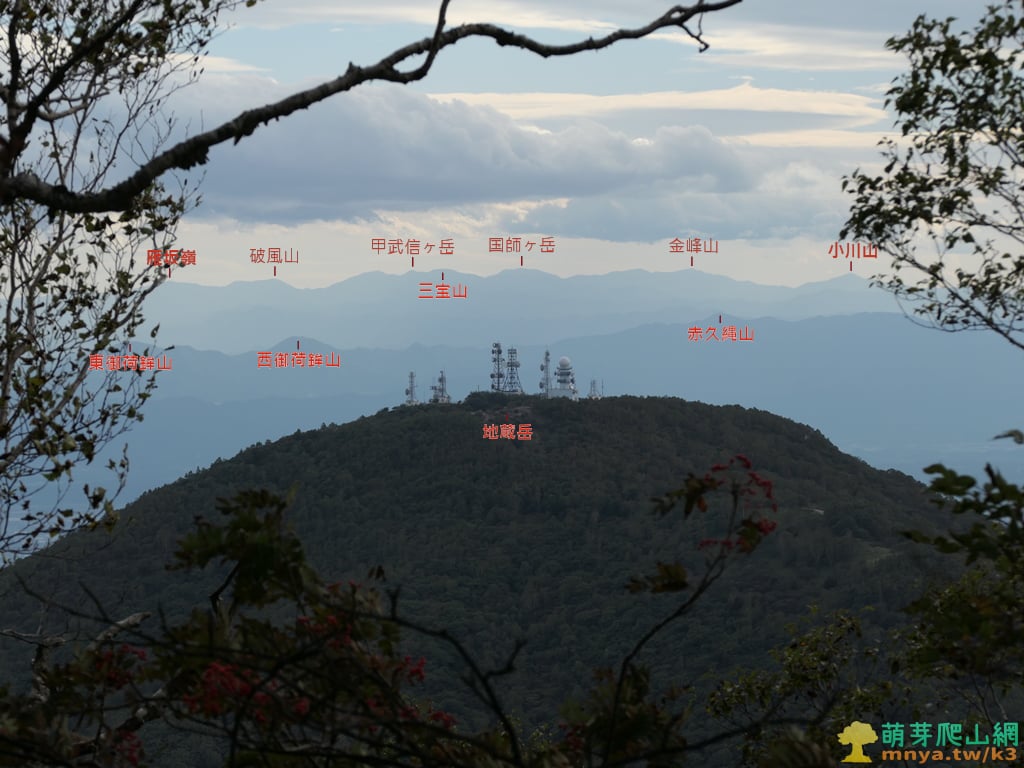 ▲往南偏西眺望以近乎可以平視的地蔵岳(1674M),山後能眺望埼玉縣境內的東御荷鉾山(1246M;三等三角點)、西御荷鉾山(1287M;二等三角點)、 赤久縄山(1523M;一等三角點)連稜,最遠可見埼玉縣與山梨縣交界的雁坂嶺(2289M;三等三角點)、破風山(2318M;三等三角點 破不山),及埼玉、山梨、長野三地交界的甲武信ヶ岳(2475M),再向右為埼玉縣與長野縣交界的三宝山(2484M;一等三角點 国師岳2);長野縣與山梨縣交界的国師ヶ岳(2592M;一等三角點)、金峰山(2599M;三等三角點 金峰)、小川山(2418M;二等三角點),視野裡的甲武信ヶ岳與金峰山為日本百名山。