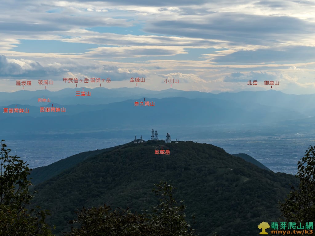 ▲地蔵岳右側往西南眺望,這個方向最遠應可以看見山梨縣內、甲府盆地西側的稜線,即赤石山脈(南阿爾卑斯)上的甲斐駒ヶ岳(2,967M;一等三角點 甲駒ケ嶽)、北岳(3193M;三等三角點 白根岳),右側遠處為八ヶ岳山系、最高點為赤岳(2899M;一等三角點),最左側可見金峰山北邊的小川山(2418M;二等三角點),與中間御座山(2112M)向北延伸至四方原山(1632M;一等三角點)、茂来山(1718M;二等三角點)稜線,再向前為荒船山(1423M;二等三角點),以及群馬縣富岡市西邊的大桁山(836M;三等三角點 滝ノ平);和上毛三山之一的妙義山(1104M;二等三角點 相馬ケ岳)。