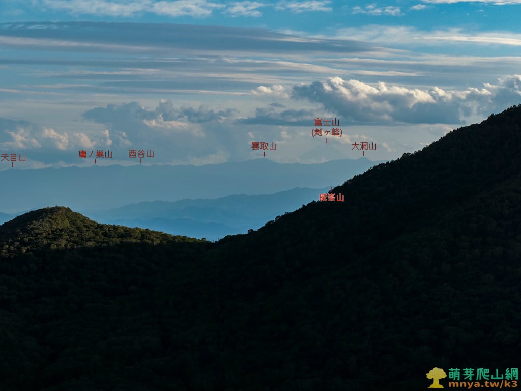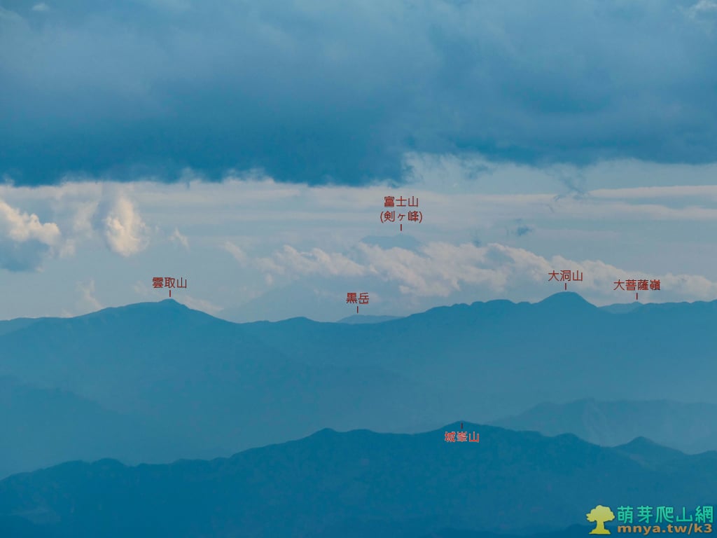 ▲從地蔵岳的左側拉近遠眺日本第一高峰 - 富士山剣ヶ峰(3776M;二等三角點),其位置就在雲取山(2017M;一等三角點)與大洞山(飛竜山;2077M;三等三角點 比竜)之間山稜的後方,雲取山左側延伸之稜線分別可見:酉谷山(1718.3M;二等三角點 小川)、鷹ノ巣山(1736.6M;二等三角點 長沢)、天目山(1576M;三等三角點 日原),與前方快被地蔵岳山體遮蔽的城峯山(1038M;一等三角點)。