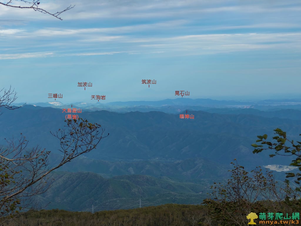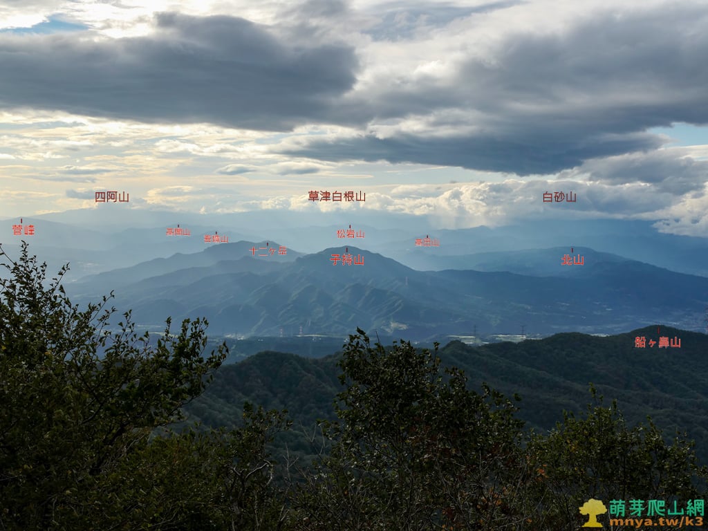 ▲絕景展望地往西眺望利根川西邊的子持山(1296M;一等三角點),與赤城山、榛名山同為一座成層火山,西邊為小野子山(1208M;四等三角點)與十二ケ岳(1201M;二等三角點),北稜尾轉西北延伸至破風山(1068M;四等三角點)、北山(1158M;二等三角點)。十二ケ岳後方、中之条以西可見吾嬬山(1182M;三等三角點)、高間山(1342M;二等三角點);北山向西可見高田山(1212M;一等三角點),左側遠眺浅間隠山北邊的菅峰(1474M;二等三角點 寒峰)。遠應可見四阿山(2354M)、草津白根山(2160M)兩座成層火山、日本百名山,及三国山脈的最高點白砂山(2140M;三等三角點 西川浦)。前方可俯瞰赤城山北稜的船ヶ鼻山(1466M)。