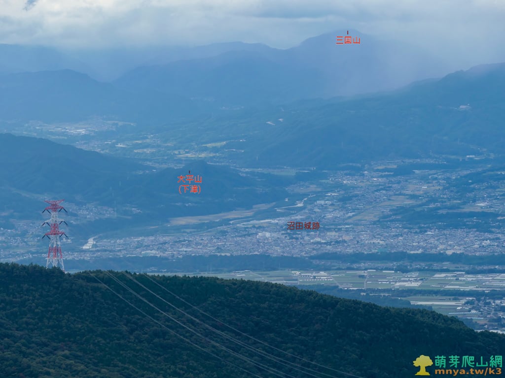 ▲往西北邊俯瞰沼田市區,前方稜脊可見船ヶ鼻山(1466M),沼田西邊可見北山(1158M;二等三角點);北邊可見大峰山(1254M;二等三角點)、三峰山(1123M;二等三角點)、高王山(766M;三等三角點 高尾)等,視野良好時可以遠眺整條三国山脈上的連峰,在厚重的雲氣下只能看見三国峠旁的三国山(1636M;二等三角點 三国嶺),其他本應可見白砂山(2140M;三等三角點 西川浦)、仙ノ倉山(2026M;二等三角點 千倉山)、谷川岳(1977M)等,三国山後方為苗場山(2145M;一等三角點)的位置。
