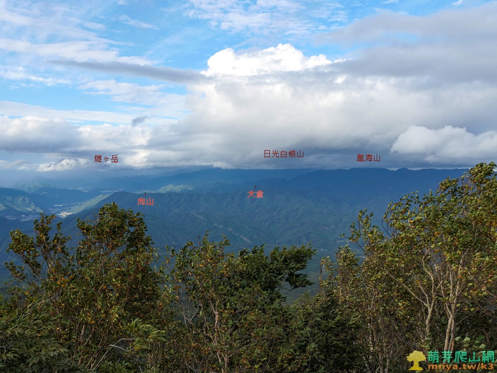 ▲往北偏東的方向應可見位於尾瀬国立公園的燧ヶ岳(2346M;二等三角點 燧岳),與關東以北最高峰 ╴日光白根山(2578M;二等三角點),東北方向可見皇海山(2144M;二等三角點),山頂被一層雲霧籠罩,前方山稜可見向山(1312M;三等三角點)、大倉(1436M;二等三角點)。