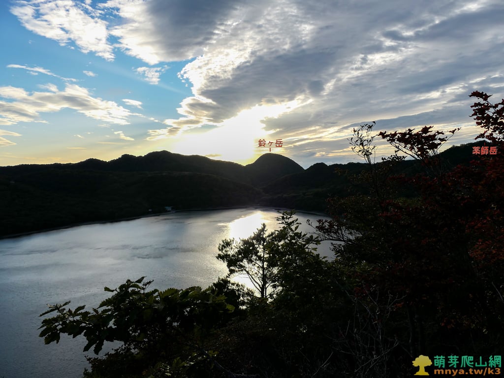 ▲眺望大沼西邊的鈴ヶ岳(1565M;三等三角點),樹叢間可見到薬師岳(1528M),湖面上折射著最後的陽光。