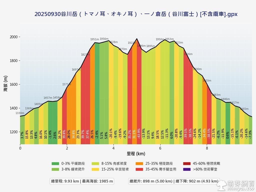 ▲航跡坡度分析圖(不含纜車,由天神平出發往返路段)。