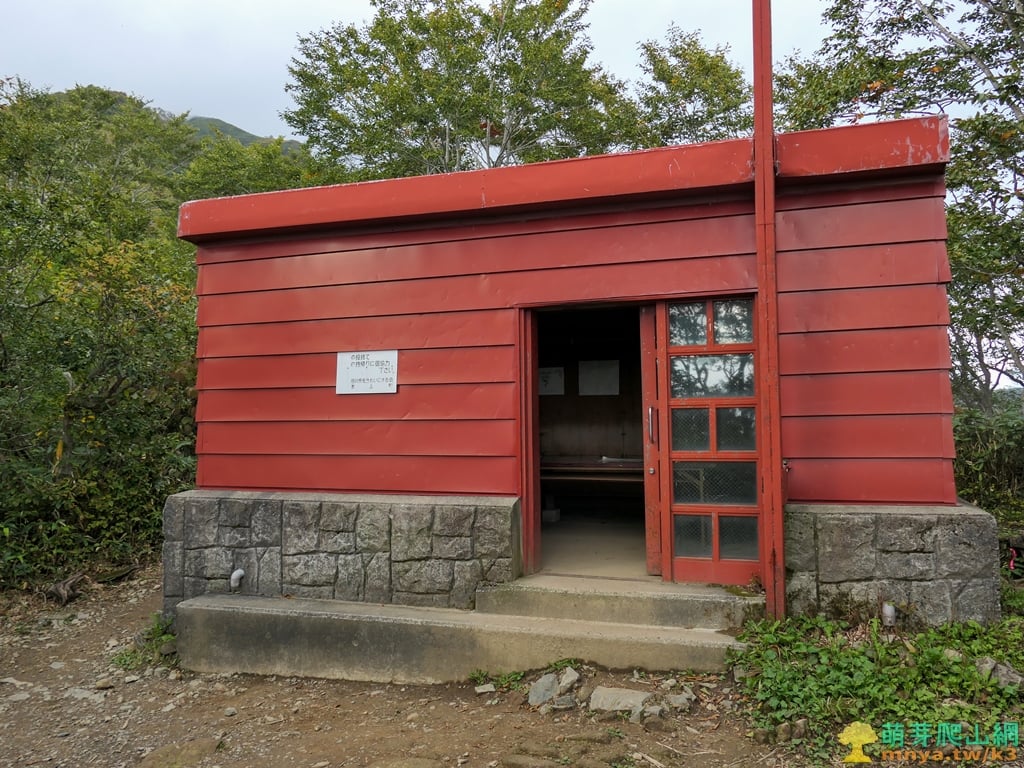 ▲熊穴沢避難小屋的正面入口,裡面有ㄇ字型的椅子、中間設有一張桌子。15:01,休息幾分鐘後繼續原路回程,最後一段路通往天神平約2.1K。