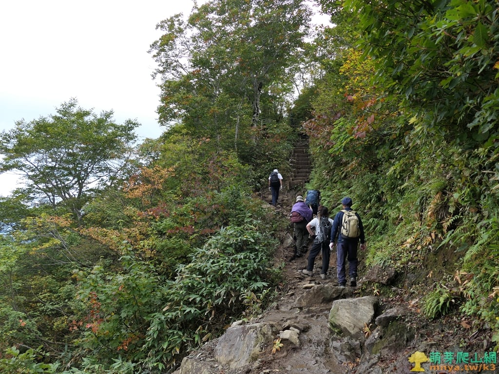 ▲順著破碎的山腰路返程,回程追上許多慢慢下山的登山隊伍,登山道上變得熱鬧許多。