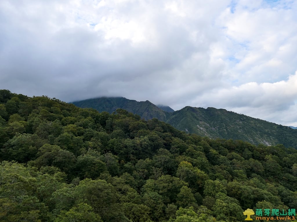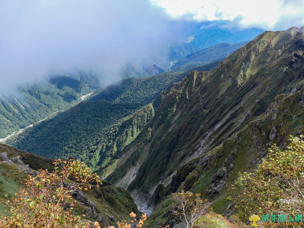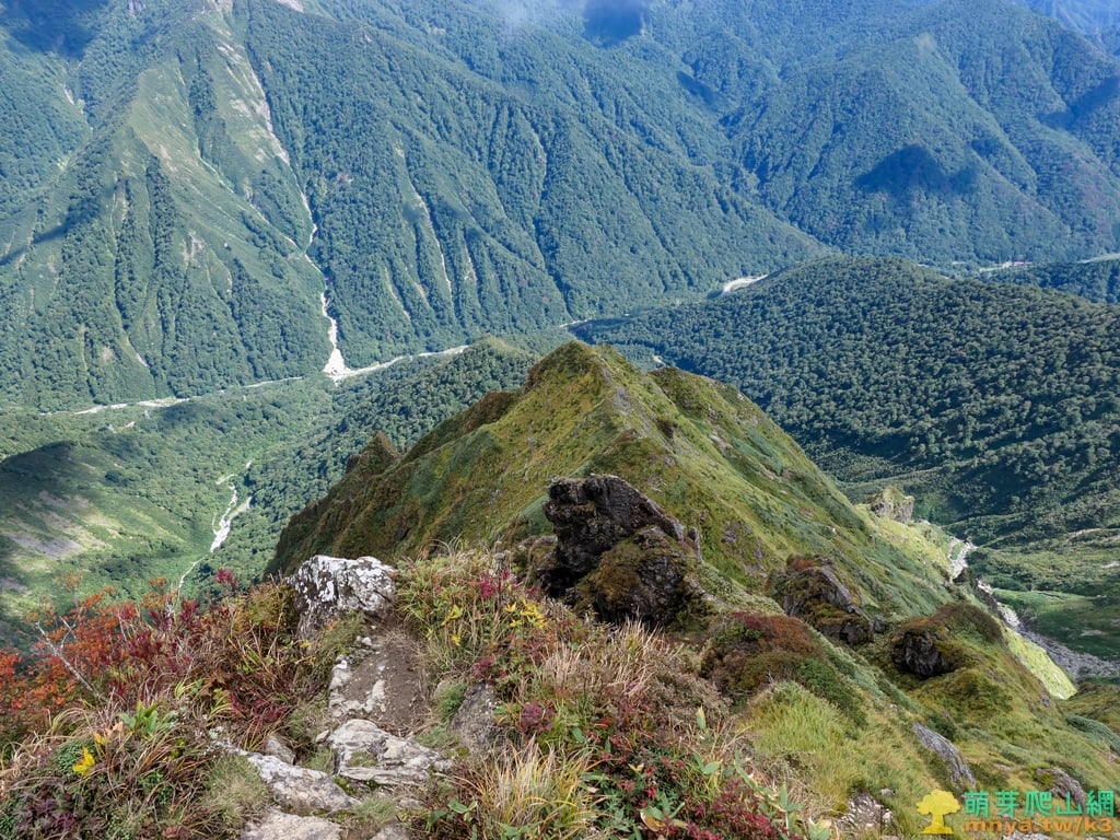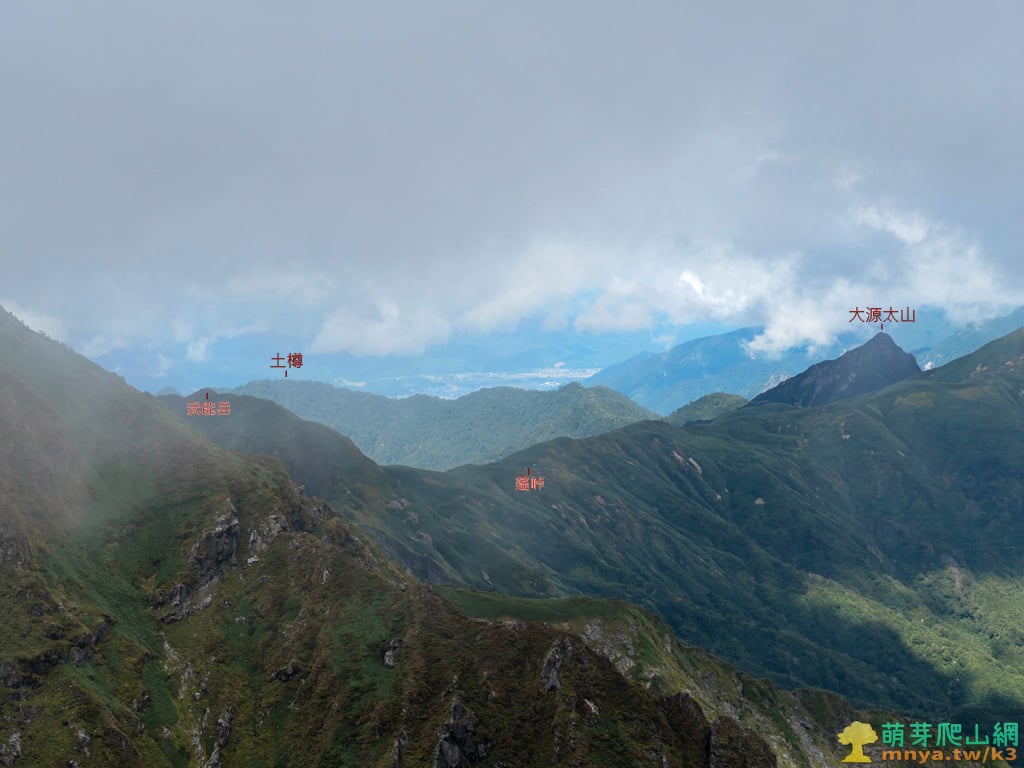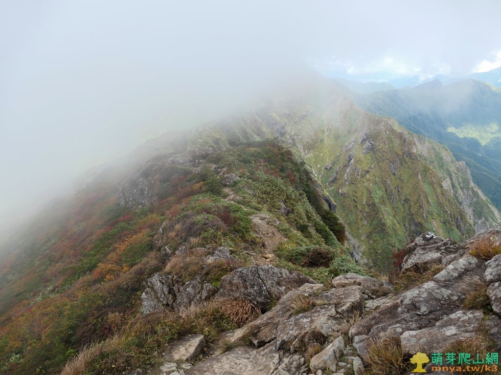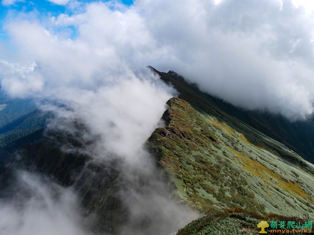 ▲繼續順著稜線陡降,漸漸降至雲霧層之下,再次能夠眺望遠處的山景。