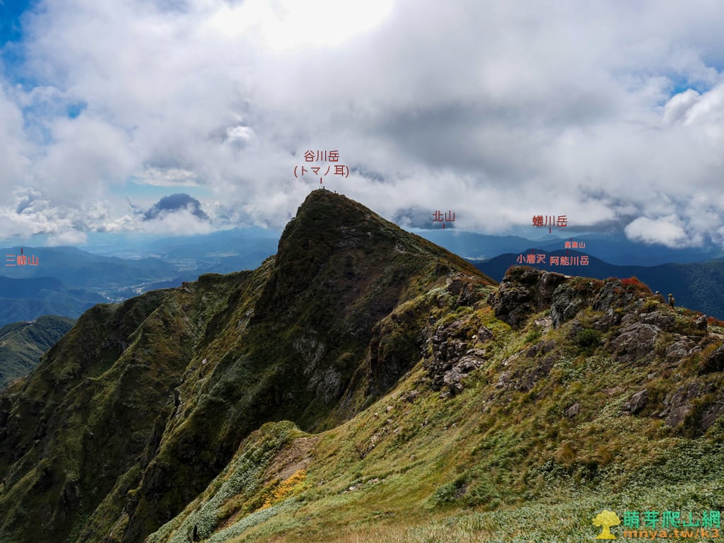 ▲谷川岳(オキノ耳)山頂往續行的北稜方向看,多數山友只會到此折返,不過我們此行還有一個目標,就是前往一等三角点百名山的一ノ倉岳(1974M)再折返,往前一點稜線平坦處有不少人在午餐休息。
