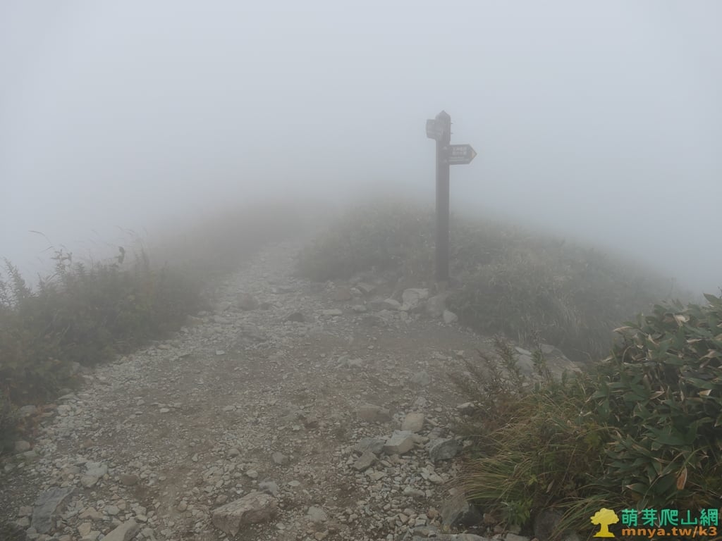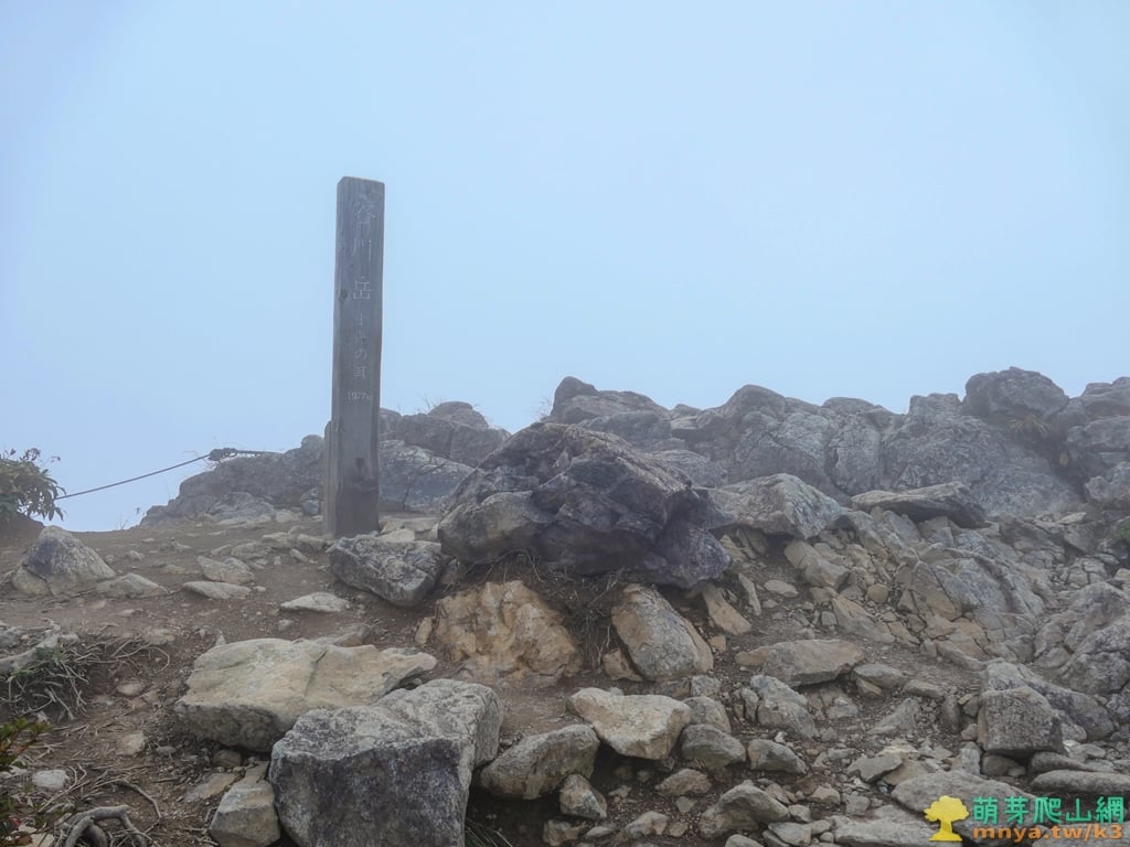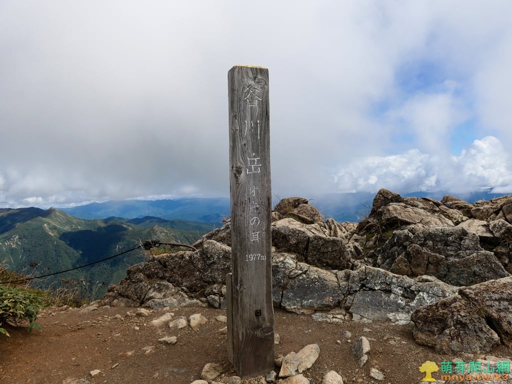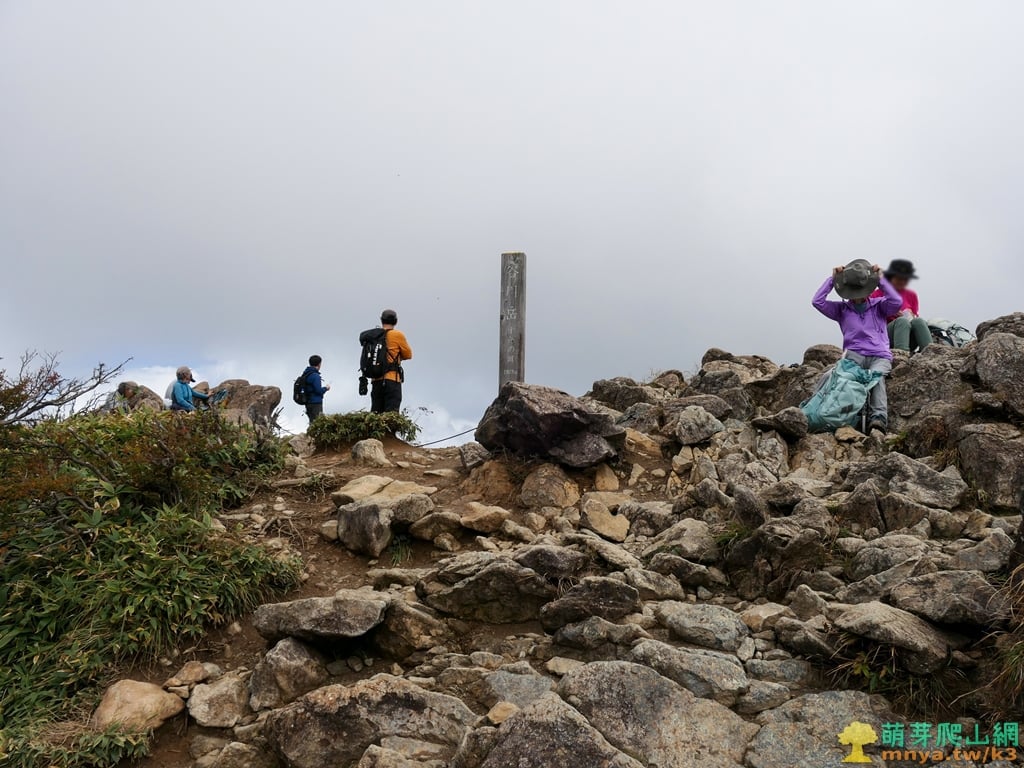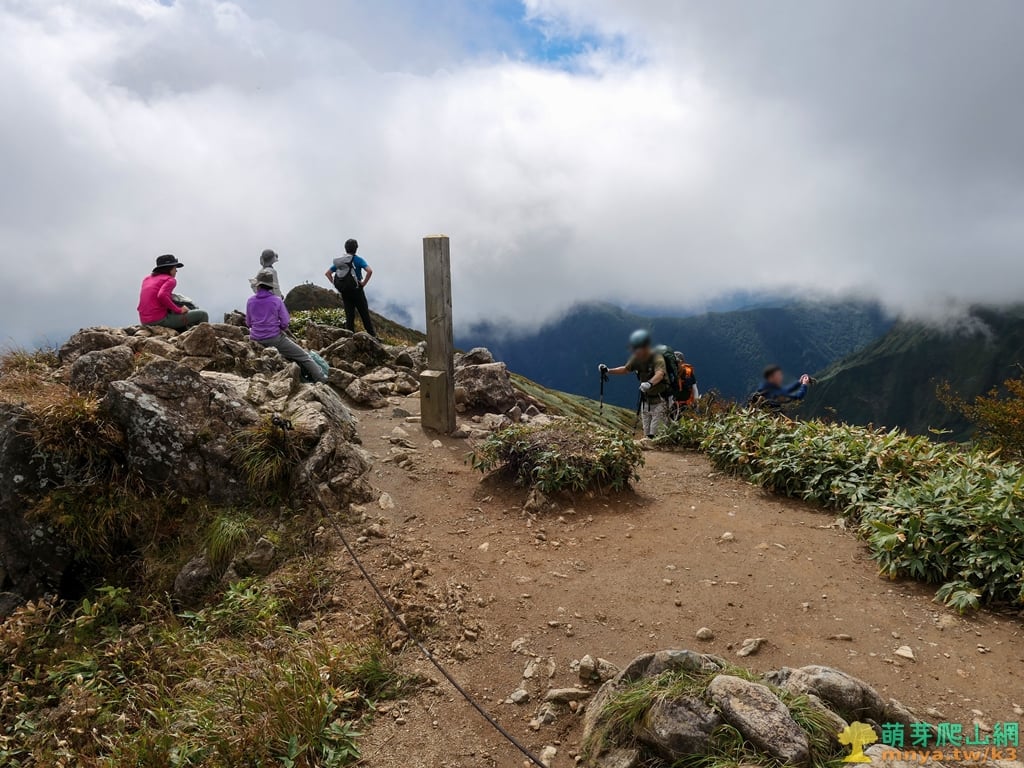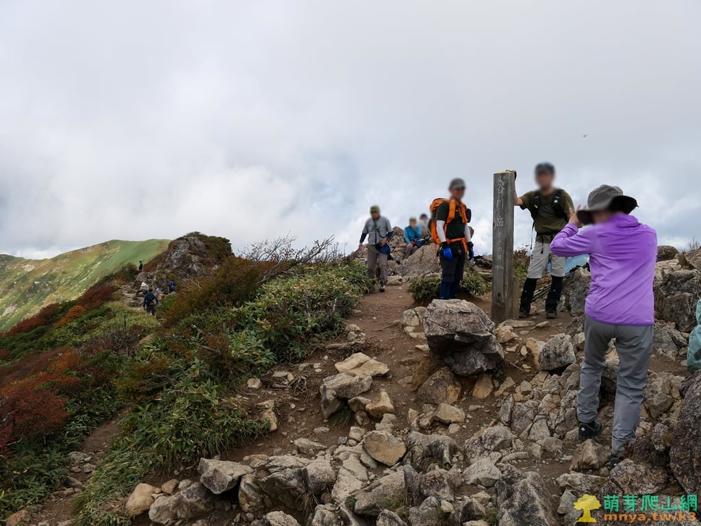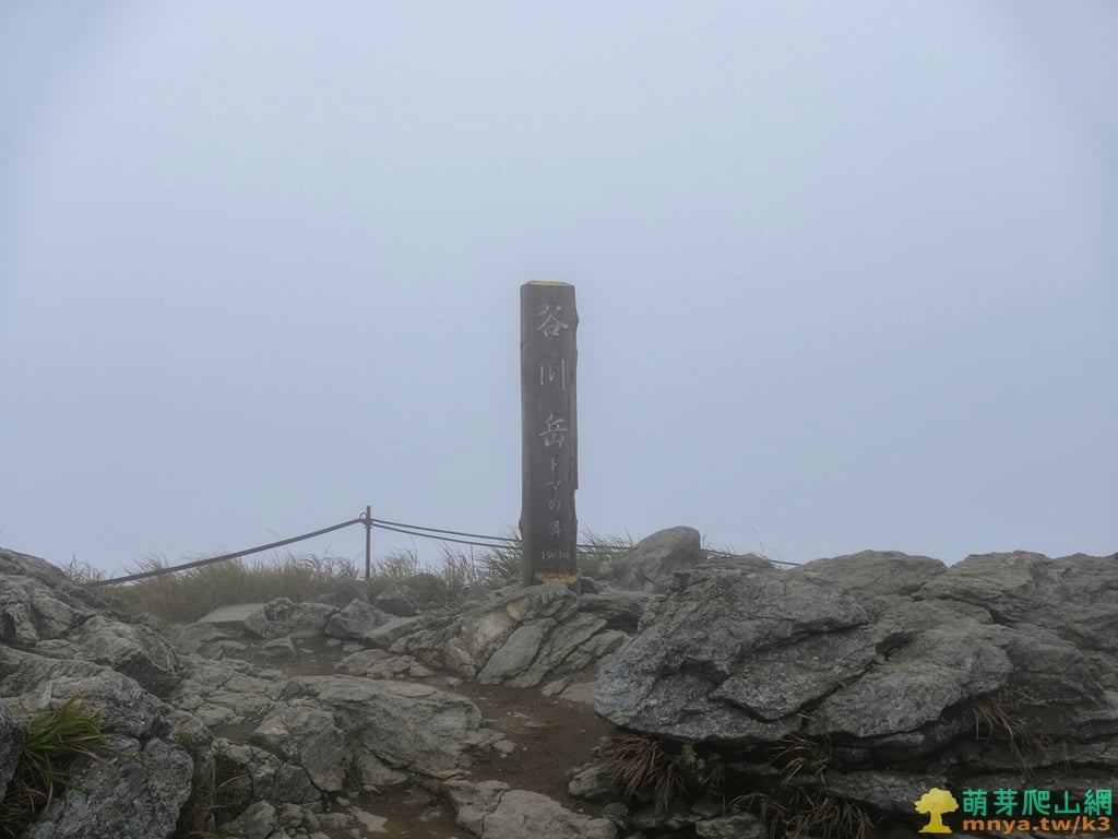 ▲谷川岳(トマの耳;1963M)之山頂木樁,稜線上的雲霧自此未再散去,幸好來時已飽覽到山景,回程就沒什麼遺憾了。