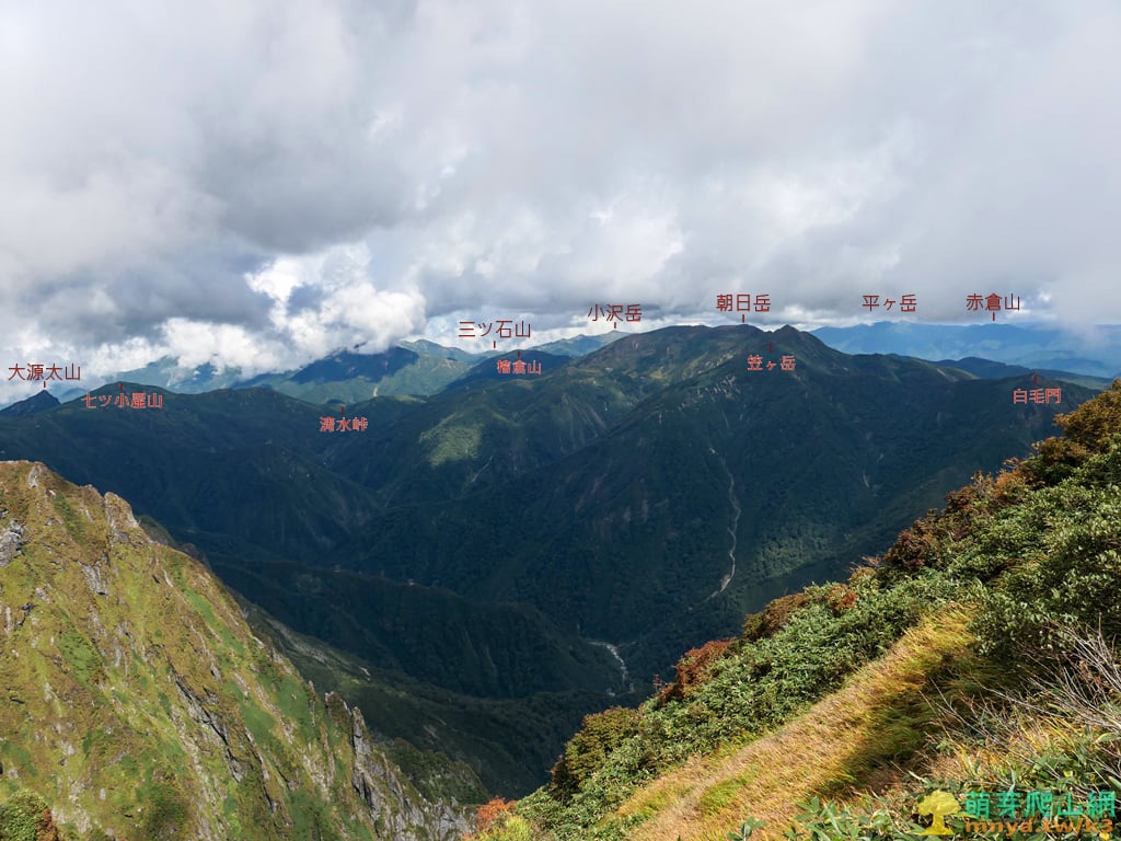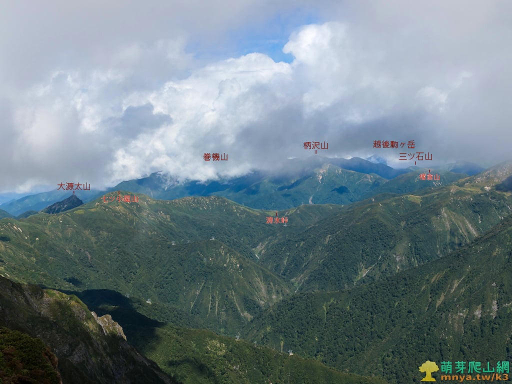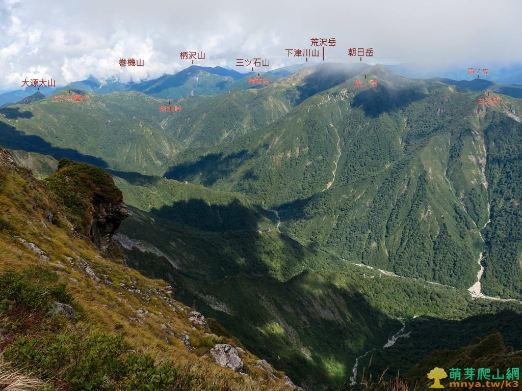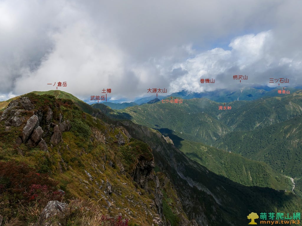 ▲稜線右側從一ノ倉沢俯瞰湯檜曽川,前方山脊左至右分別可見大源太山(1598M)、七ツ小屋山(1675M;三等三角點)、清水峠(1448M)、朝日岳(1945M;二等三角點)、笠ヶ岳(1852M;三等三角點)、白毛門(1720M)。朝日岳向北山稜可見檜倉山(1744M;三等三角點 一本松),再往北是日本百名山之一的巻機山(1967M)於雲霧中,巻機山向東稜延伸可見三ツ石山(1586M)、小沢岳(1946M)。朝日岳右後方可遠眺日本百名山之一的平ヶ岳(2141M;二等三角點),及其向南延伸稜線突起的赤倉山(1959M;三等三角點)。