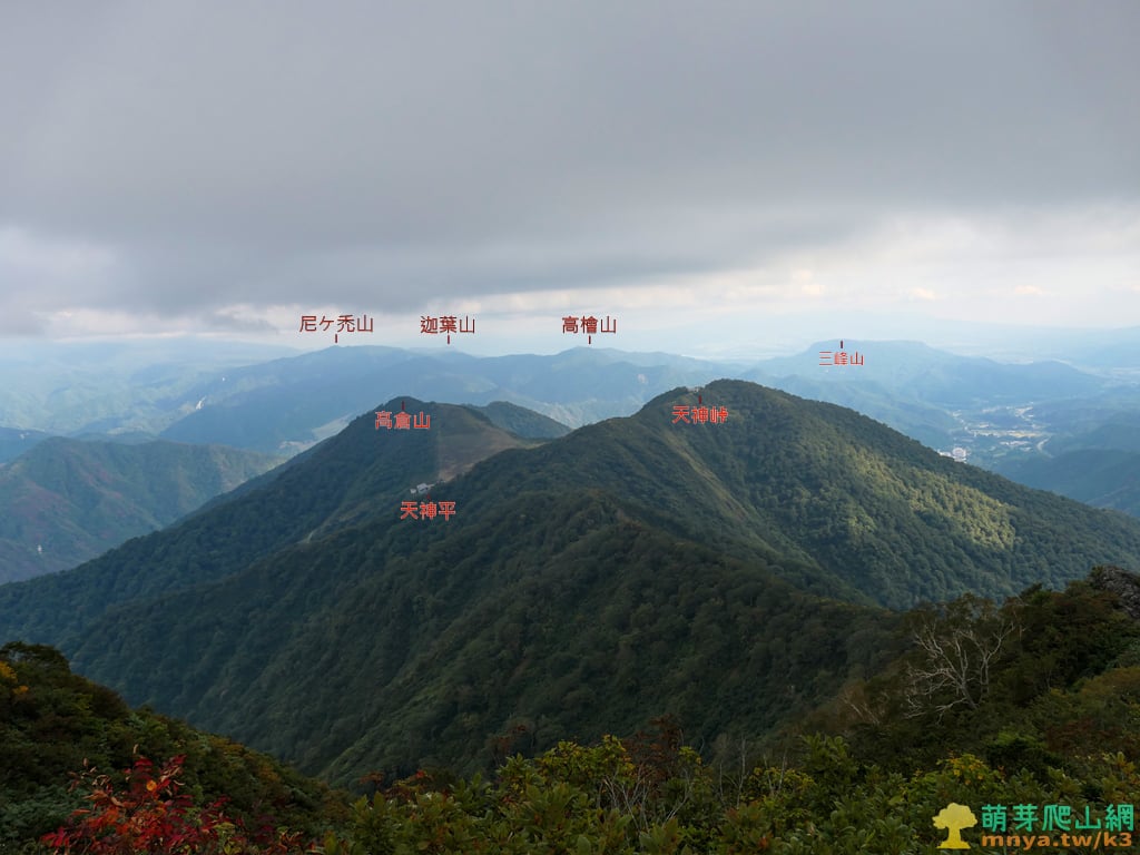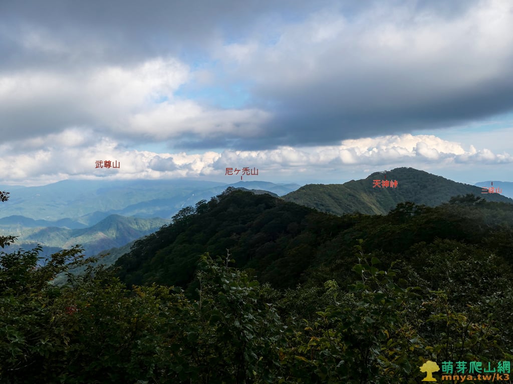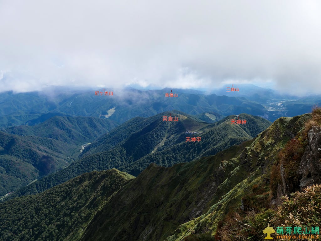 ▲往南眺望稜尾的天神峠(1502M),左側遠眺雲中的武尊山(2158M;一等三角點),與其西稜延伸的尼ケ禿山(1466M;二等三角點),天神峠之右側可見三峰山(1123M;二等三角點)。