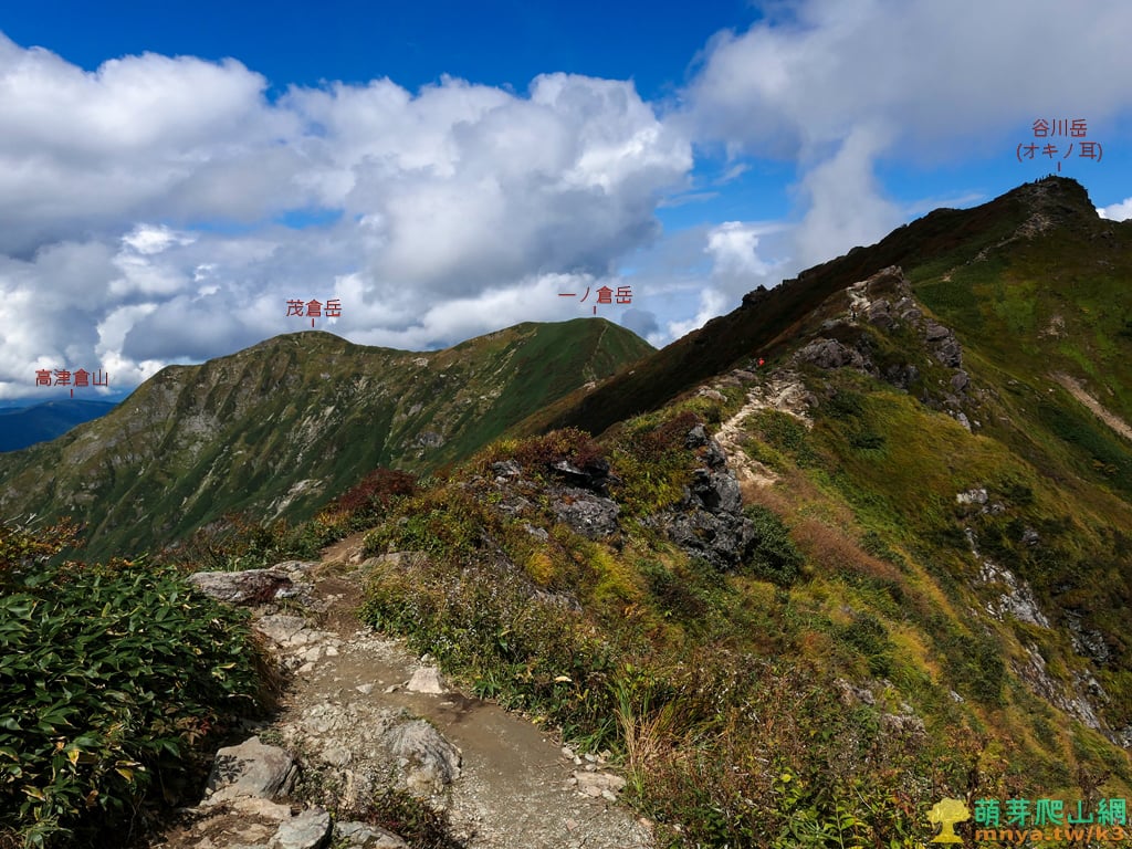 ▲續行通往谷川岳(オキの耳)的稜線路,不時繞過稜線上突起的岩塊,山稜兩側視野絕佳。