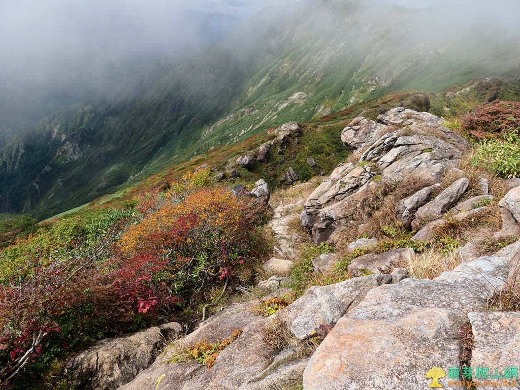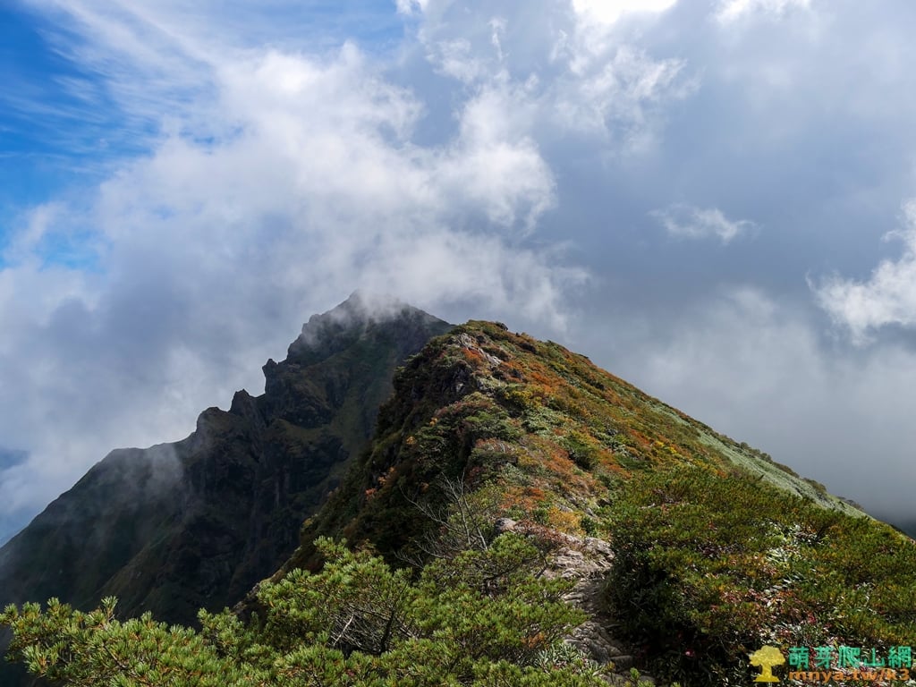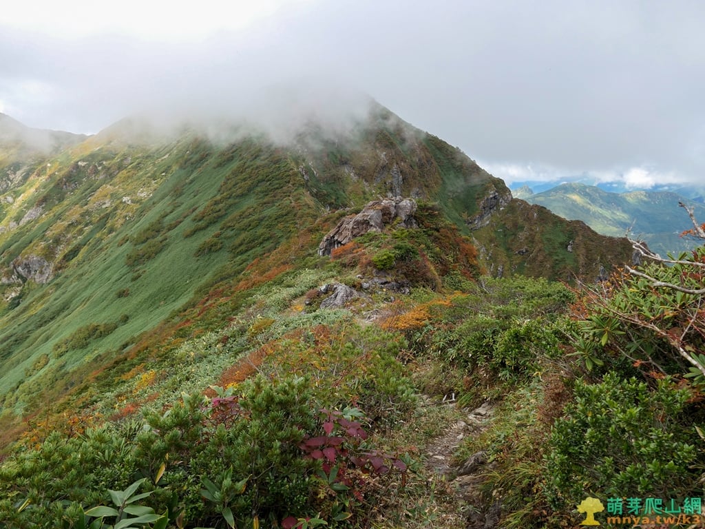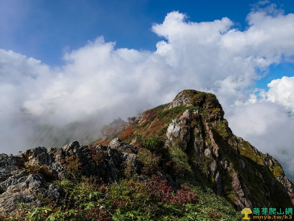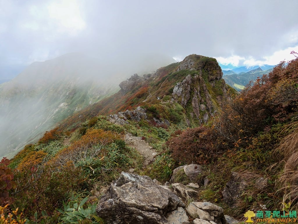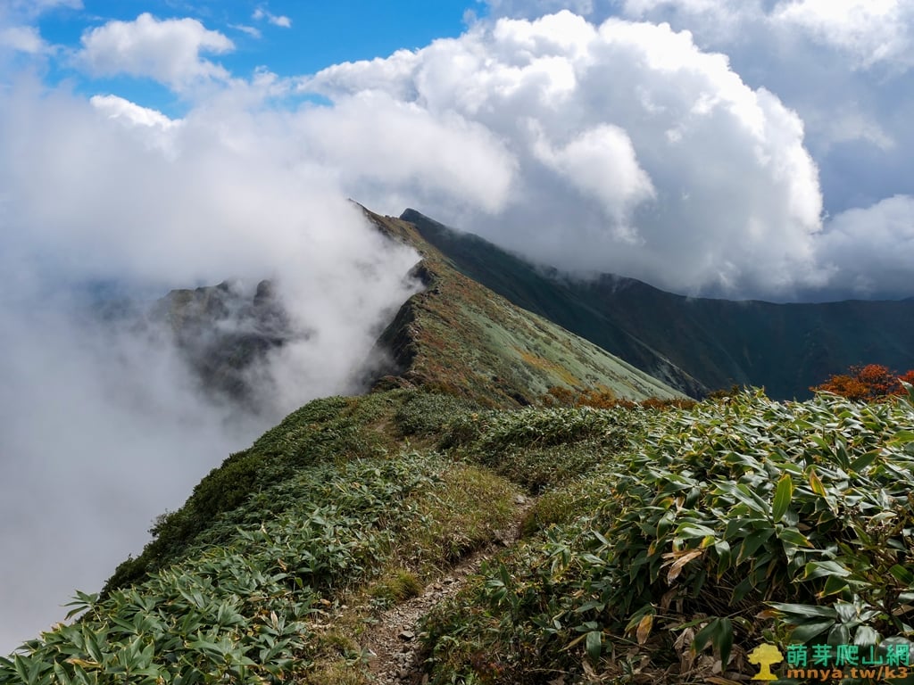 ▲11:30,於谷川岳(オキの耳)拍照休息稍作停留後,續行向北稜線往一ノ倉岳前進,直距還有約1.5K,此時正好又一陣雲霧翻過山稜遮蔽視線。