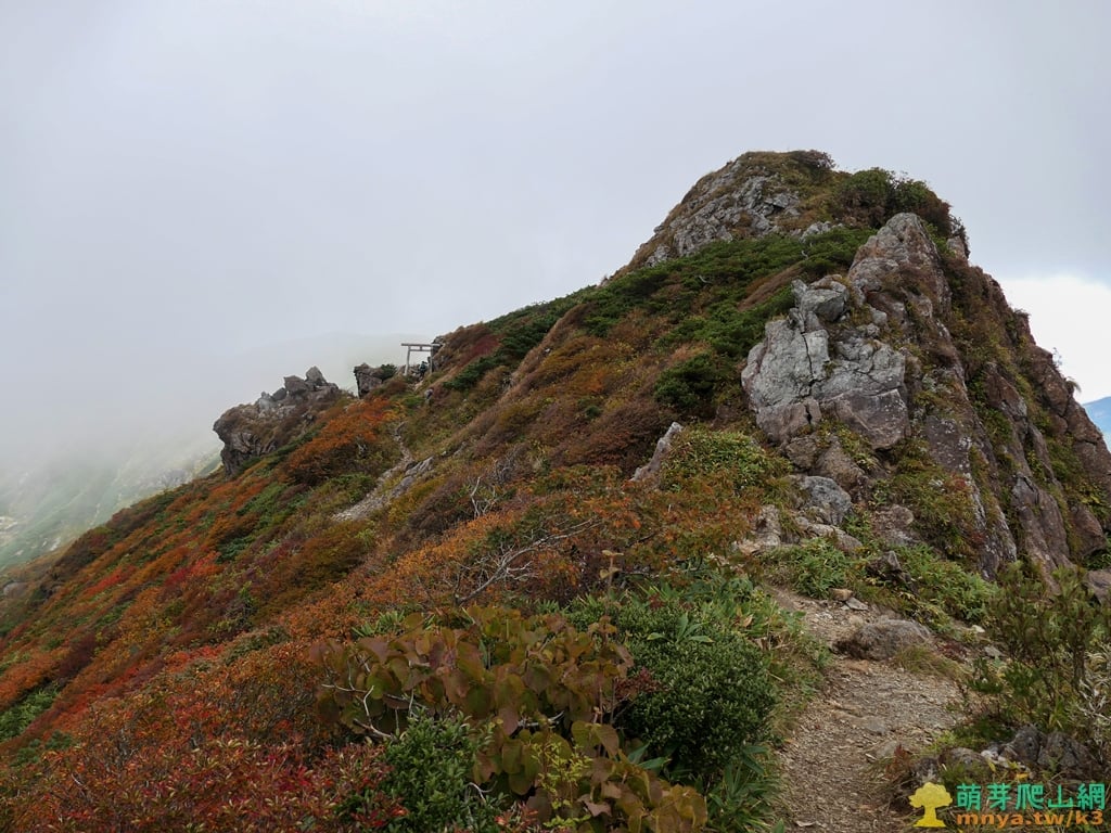 ▲13:37,原路返回谷川岳(オキの耳),從一ノ倉岳回至此處費時51分鐘,返回一ノ倉岳走約2小時7分鐘。幾乎是同一時刻天氣狀況急轉直下,冷冽的寒風與濃霧霎時間籠罩山頂,周圍轉瞬間只剩一片白牆,拍拍照後趕緊跟著人群原路下山。