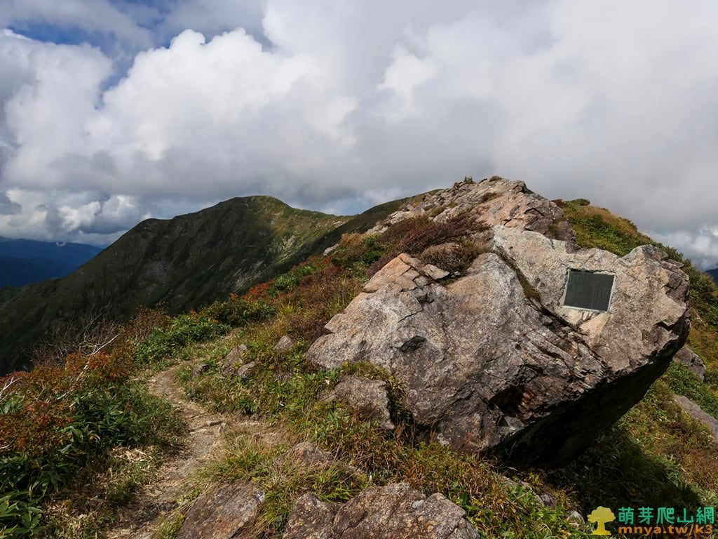 ▲13:16,返回稜線上的「Bルンゼの頭」突岩,回頭可以看見石岩上鑲嵌著的「憶出の碑(昭和30年8月建)」。