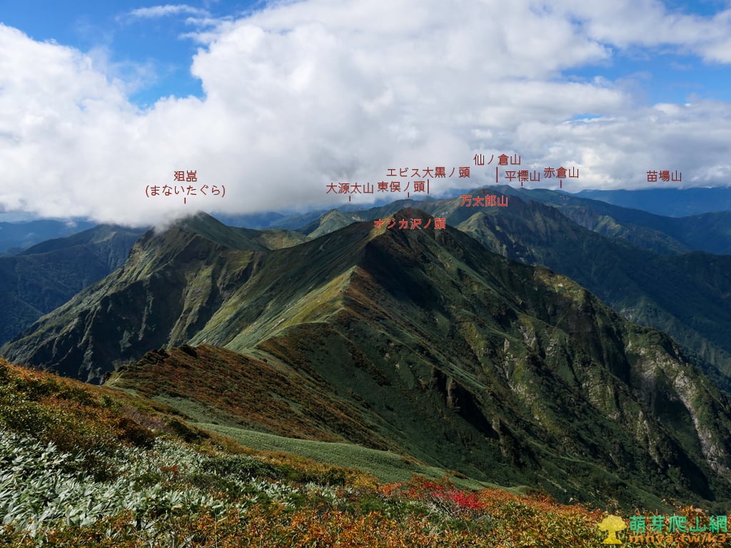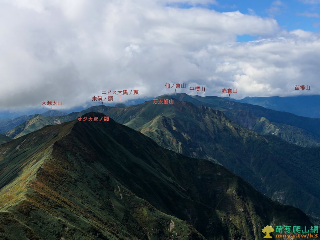 ▲拉近看谷川岳西稜由近至遠分別可見:オジカ沢ノ頭(1894M)、万太郎山(1956M;三等三角點)、東俣ノ頭(1718M)、エビス大黒ノ頭(1888M)、仙ノ倉山(2026M;二等三角點)、平標山(1984M;三等三角點 松出)、大源太山(1764M;三等三角點 耕地),右側可向西遠眺清津川對面的赤倉山(1939M;三等三角點 二居)至苗場山(2145M;一等三角點)山稜,苗場山為日本百名山之一,山頂仍在雲霧籠罩中。