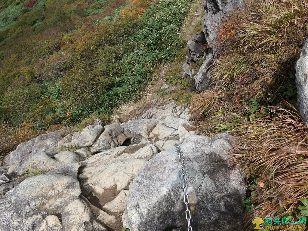 ▲11:59,陡降岩場地形,落差較大且有架設鐵鍊,是谷川岳通往一ノ倉岳途中最危險的一段路。