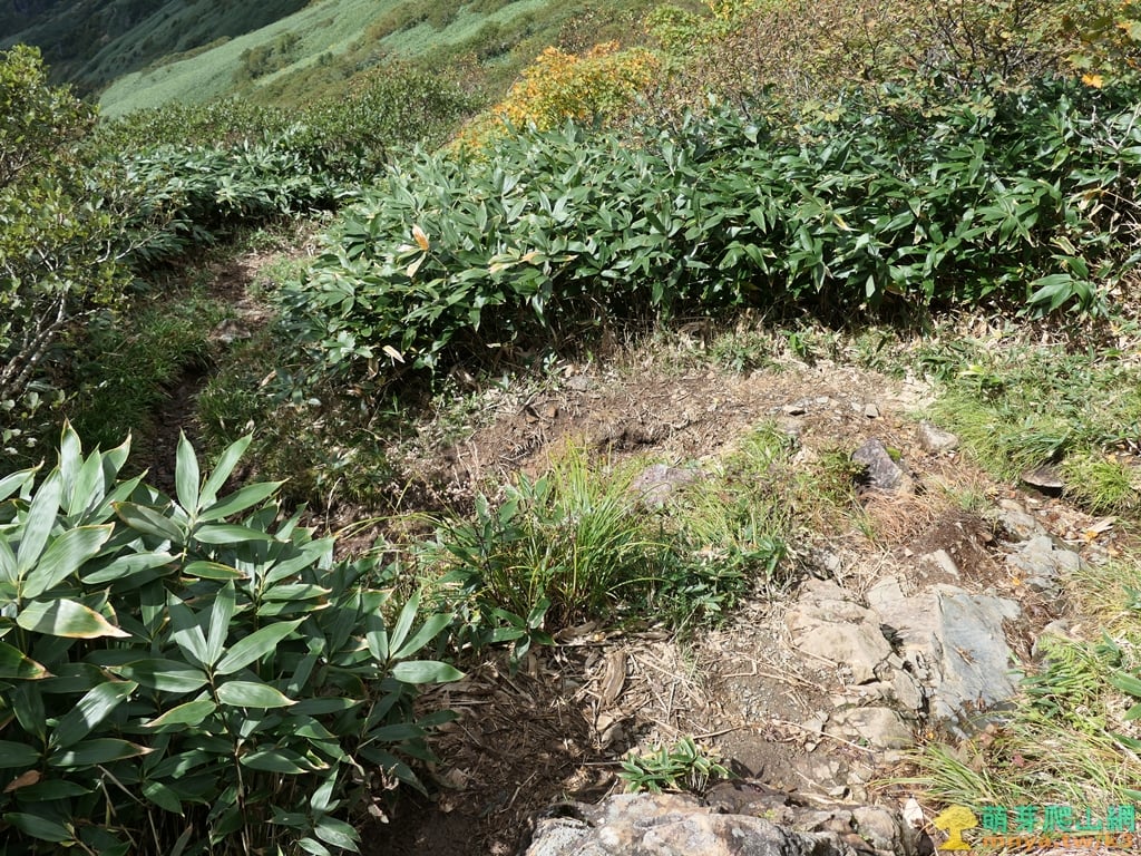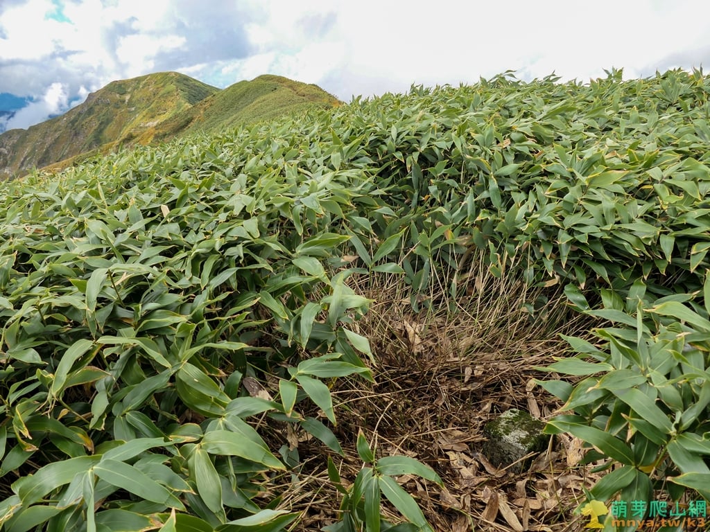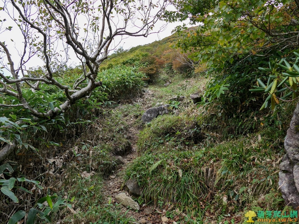 ▲續行順著稜左側的箭竹山坡陡下,草坡一側的土徑顯得比較溼濘。