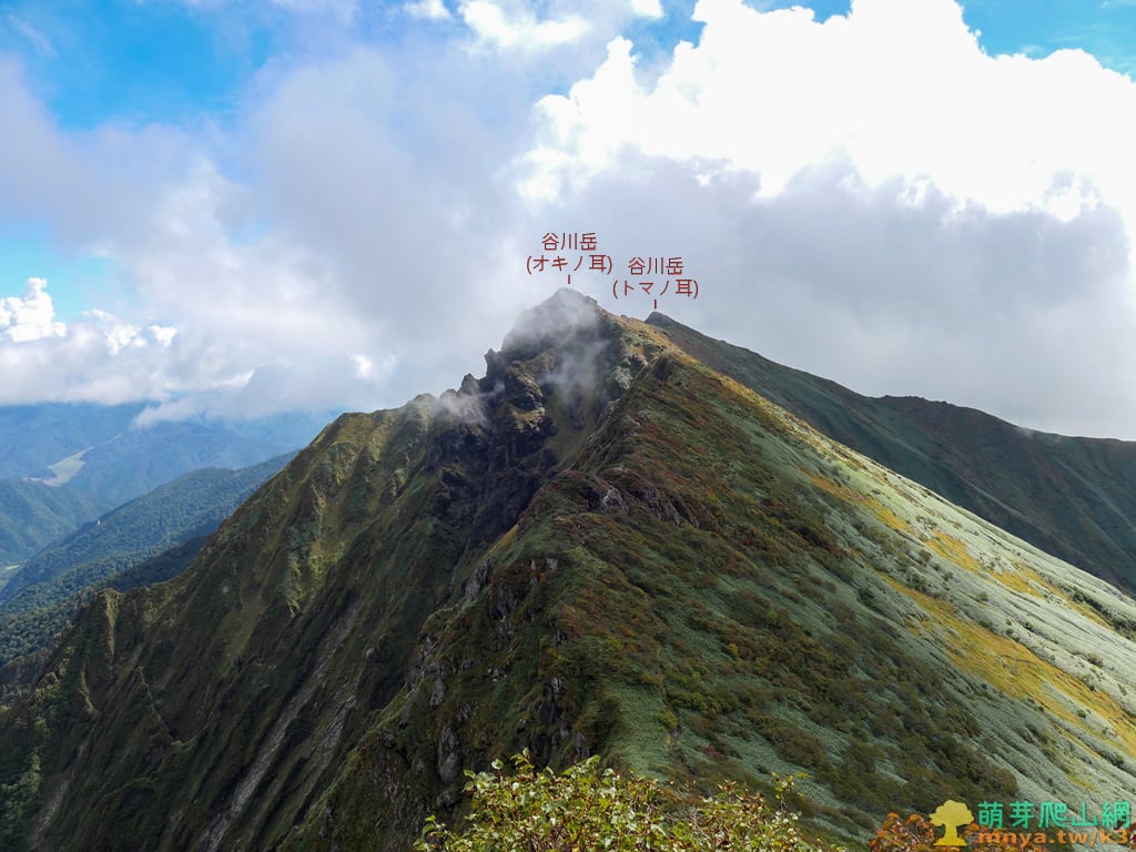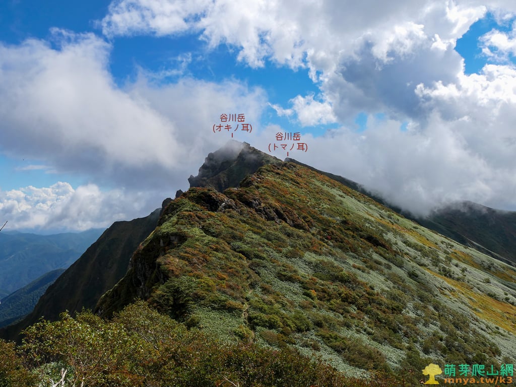 ▲拉近看谷川岳前峰 – トマの耳 (1963M),形狀呈單面山,單邊是直落マチガ沢的絕壁,只有走在稜線上才是安全的。