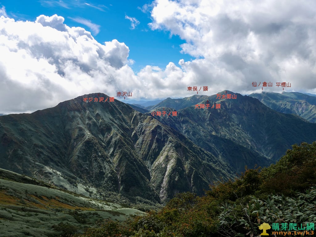 ▲稜左往西眺望谷川連峰西稜,依山稜由近至遠分別可見:オジカ沢ノ頭(1894M)、小障子ノ頭(1730M)、大障子ノ頭(1800M)、万太郎山(1956M;三等三角點)、東俣ノ頭(1718M)、仙ノ倉山(2026M;二等三角點)、平標山(1984M;三等三角點 松出),是分隔太平洋與日本海的中央分水嶺氣候多變,最遠可見群馬縣吾妻郡與水上町交界的赤沢山(1455M;三等三角點)。