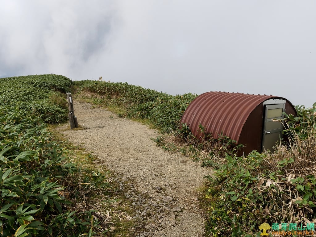 ▲12:21,抵達一ノ倉岳山頂平台,從谷川岳(オキの耳)走來費時51分鐘,右側有一間由鐵皮建成的一ノ倉岳避難小屋,建於昭和38年(1963年)10月,至於一ノ倉岳一等三角點則位於前方山徑左側的箭竹叢中。