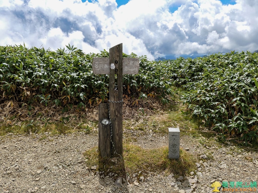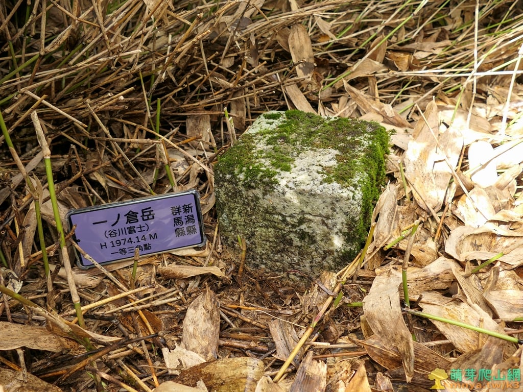 ▲12:24,取左踩著箭竹林進入約數公尺即可見到一ノ倉岳、谷川富士一等三角點,於箭竹叢中基石處有被清出一小點空間,走進來後幾乎是一眼可見,從谷川岳(オキの耳)走來費時54分鐘,從天神平纜車站走來總費時3小時30分鐘。
