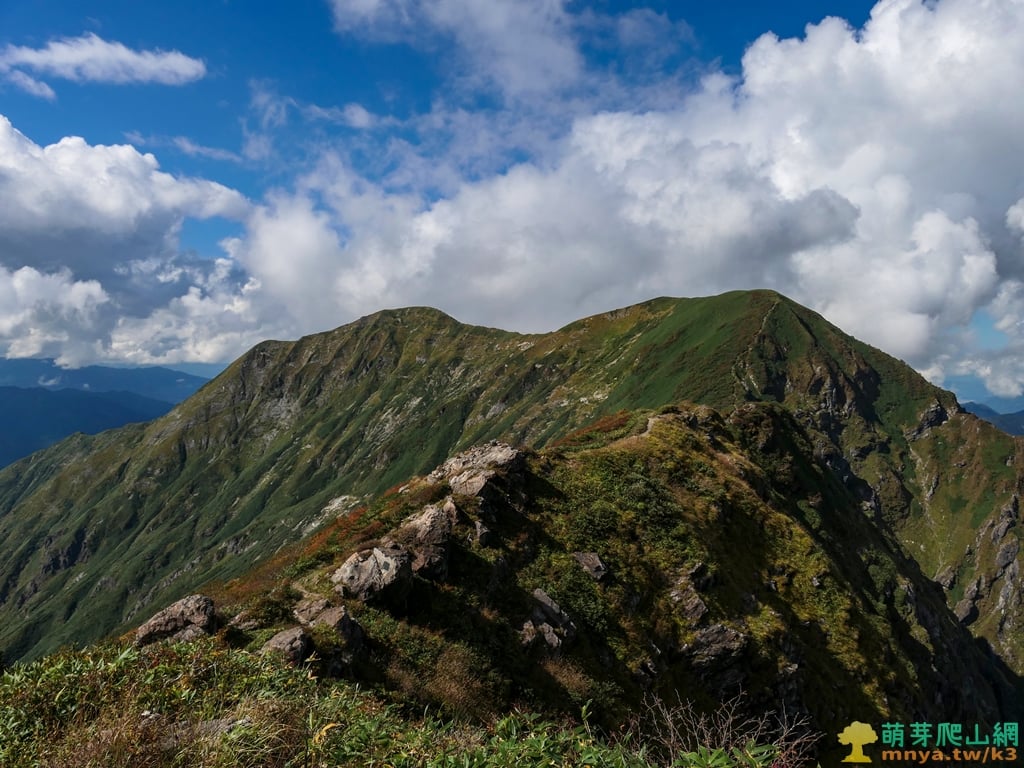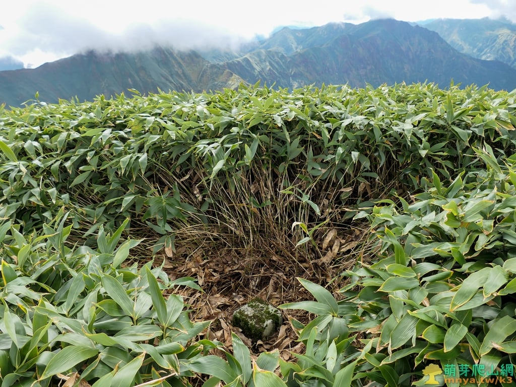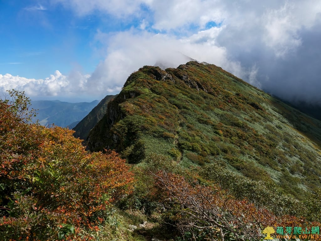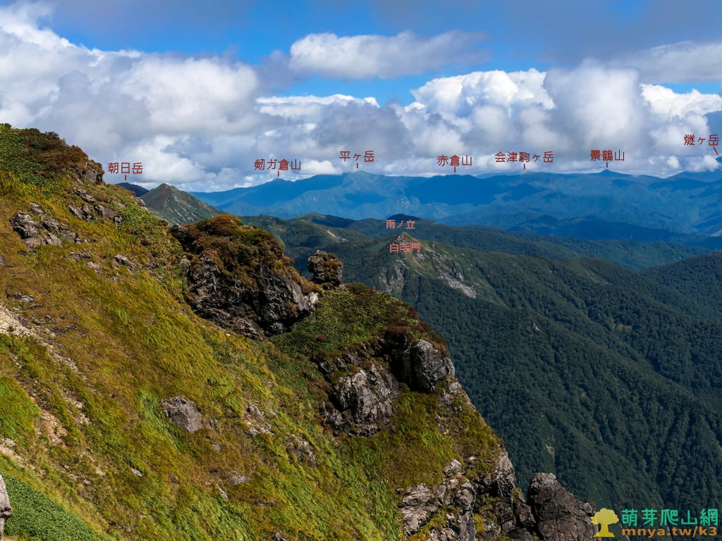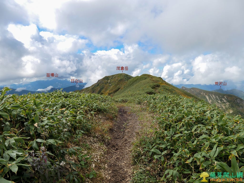 ▲從平台處在往前約15公尺取左入箭竹叢,前方稜線山徑通往茂倉岳(1978M),茂倉岳左側山稜可見日白山(1631M);右側可見荒沢山(1303M;三等三角點 角南),最遠可見日本百名山之一的苗場山(2145M;一等三角點),周圍的雲霧正在不斷堆積,但頭頂的天空仍是藍天白雲。