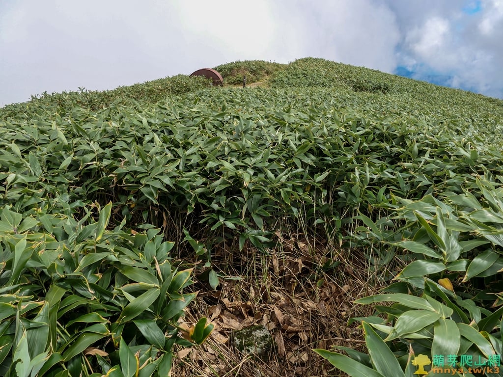 ▲順稜拉繩陡上,山稜上的箭竹植被茂盛,路徑有清理過還算好走。