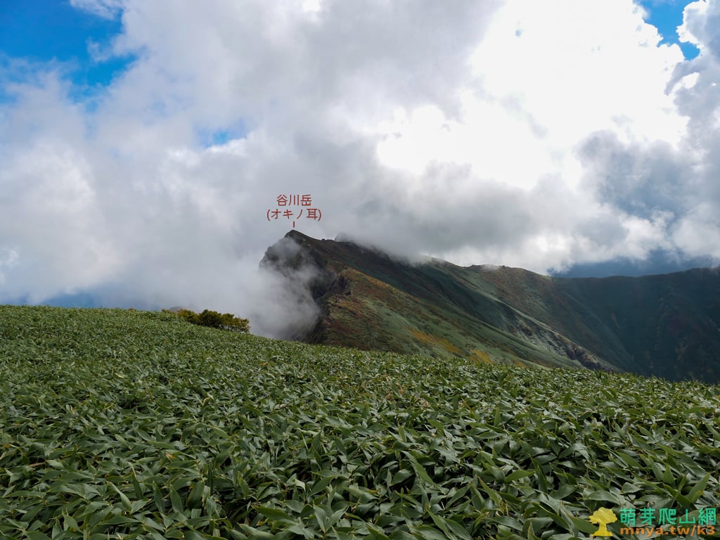▲谷川岳(オキノ耳)山頂全景,オキの耳雖然是二耳山的最高峰,但山頂並沒有設立三角點,其北邊供奉富士淺間神社的奧之院,因而被稱為「谷川富士」或「淺間岳」,其中「谷川富士」的名稱後來被標註於一ノ倉岳(1974M),直至1961年(昭和36年)版地圖起,才統一標示為「一ノ倉岳」。