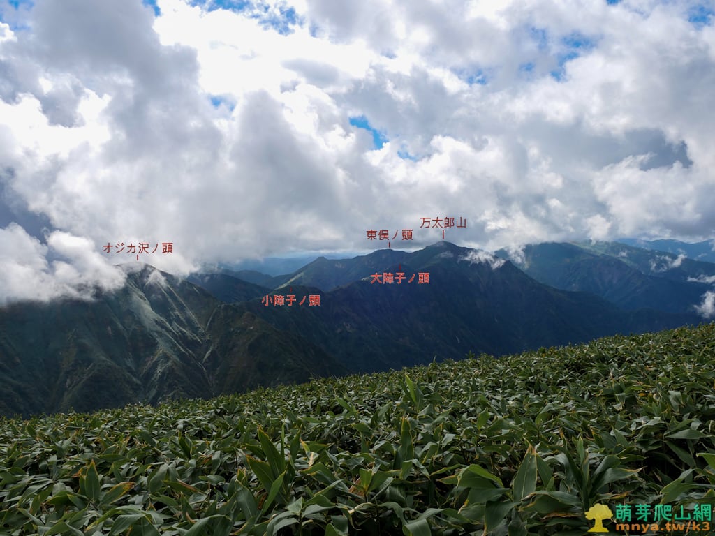 ▲往東南方向眺望谷川連峰西稜,依序可見:オジカ沢ノ頭(1894M)、小障子ノ頭(1730M)、大障子ノ頭(1800M)、万太郎山(1956M;三等三角點)、東俣ノ頭(1718M),再往西延伸山稜上的仙ノ倉山(2026M;二等三角點)、平標山(1984M;三等三角點 松出)等已被漸漸升起的雲霧遮蔽。