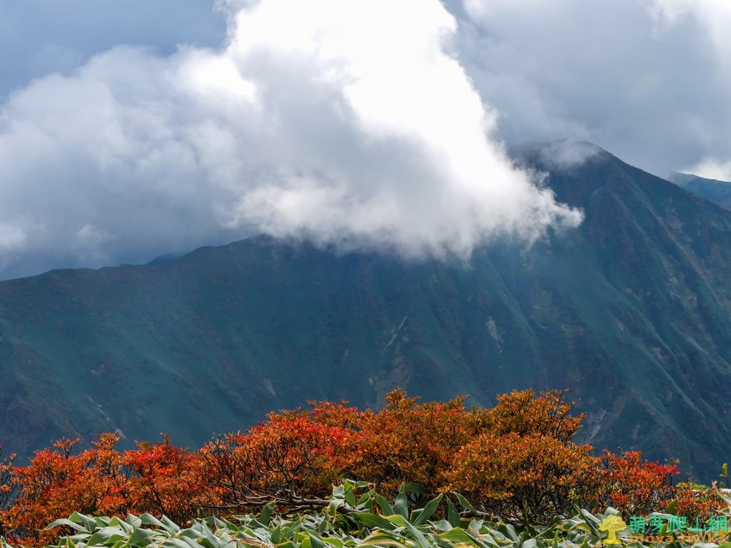 ▲秋天的紅葉搭配遠方的山景,後方正對著谷川岳西稜的オジカ沢ノ頭(1894M),過中午後山稜漸漸被黑雲籠罩,再過不久就要風雲變色的預感。