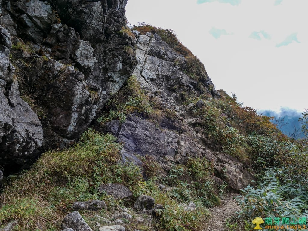 ▲沿著絕壁上方的稜線前行,此段路坡度較緩,岩石障礙較少。