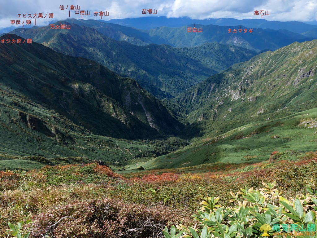 ▲俯瞰山稜左側流向新潟方面的万太郎谷,左側可見谷川連峰西側的オジカ沢ノ頭(1894M)、万太郎山(1956M;三等三角點)、東俣ノ頭(1718M)、エビス大黒ノ頭(1888M)、仙ノ倉山(2026M;二等三角點)、平標山(1984M;三等三角點 松出),前方中間稜線可見平標山北稜延伸的日白山(1631M)、タカマタギ(1529M;三等三角點 棒立),最遠可眺望赤倉山(1939M;三等三角點 二居)、苗場山(2145M;一等三角點)、高石山(1510M;二等三角點)的山稜,日本百名山之一的苗場山頂仍藏在雲中。