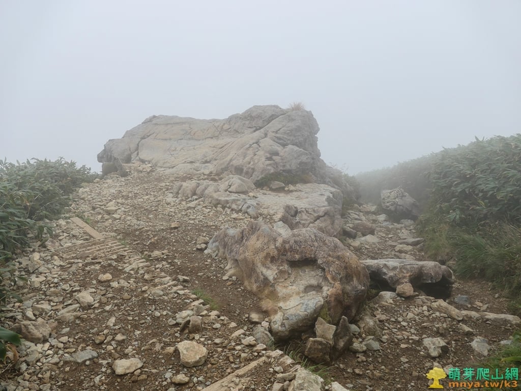 ▲11:14,陡上坡前稜線上有一塊突起的巨石,山徑步道從左側繞過。