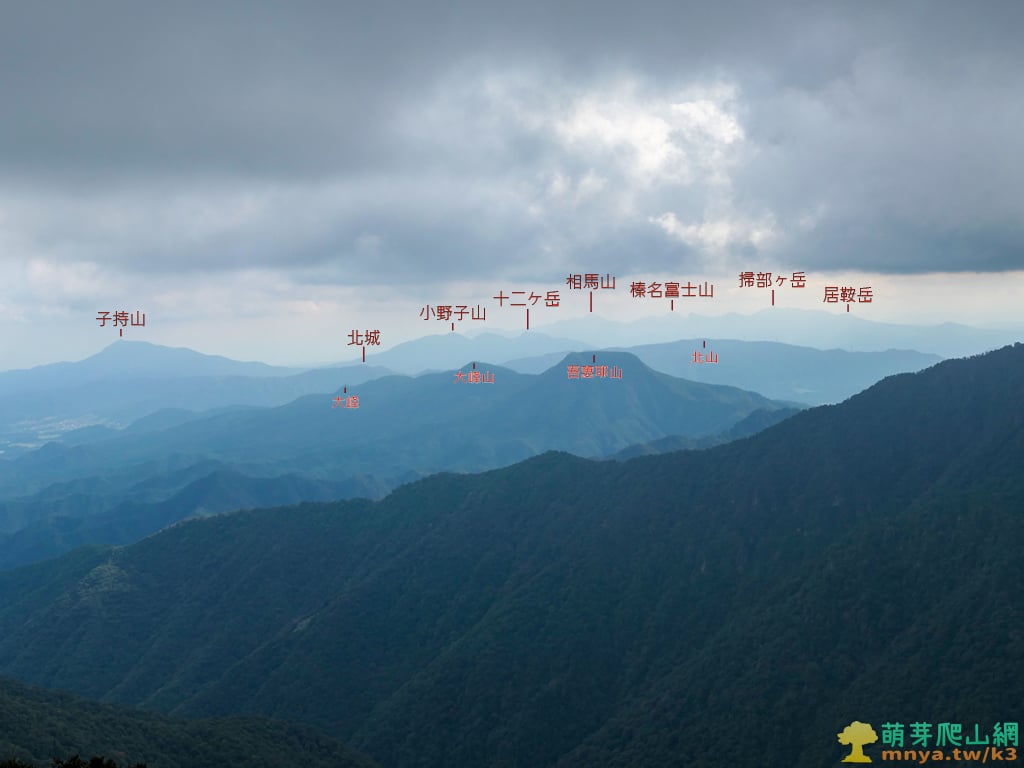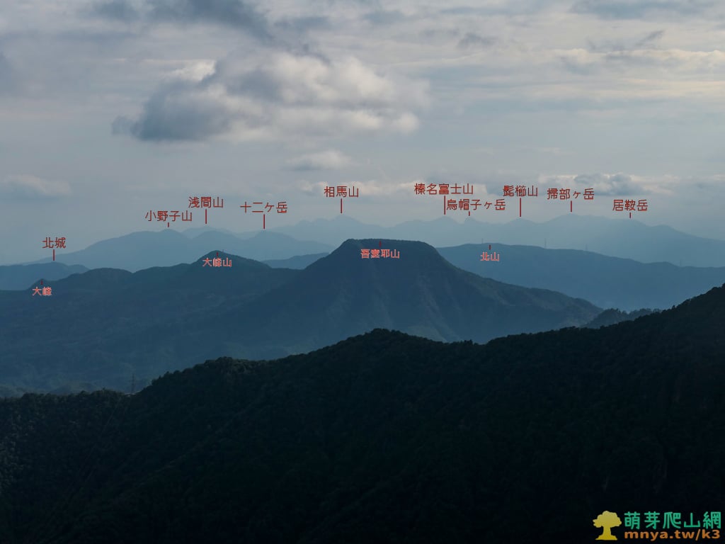 ▲往南眺望利根川西側的群山,近處可見大峰(1055M;三等三角點)、大峰山(1254M;二等三角點)、吾妻耶山(1341M;三等三角點 吾妻山)連稜,後一層山稜可見北城(968M;二等三角點)至北山(1158M;二等三角點)的稜線,第三層山巒分別可見:子持山(1296M;一等三角點)、小野子山(1208M;四等三角點)、十二ケ岳(1201M;二等三角點),最遠可眺望榛名火山群,左至右可見:相馬山(1411M)、榛名富士山(1391M;一等三角點)、掃部ヶ岳(1449M)、居鞍岳(1340M;三等三角點)。