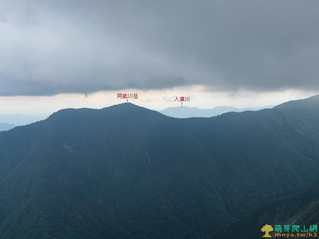 ▲往西南方向眺望谷川對面的阿能川岳(1611M;二等三角點),山脊後方眺望稜線上有電塔的入須川(1431M;二等三角點),陰雲之下視線距離意外的還不錯。