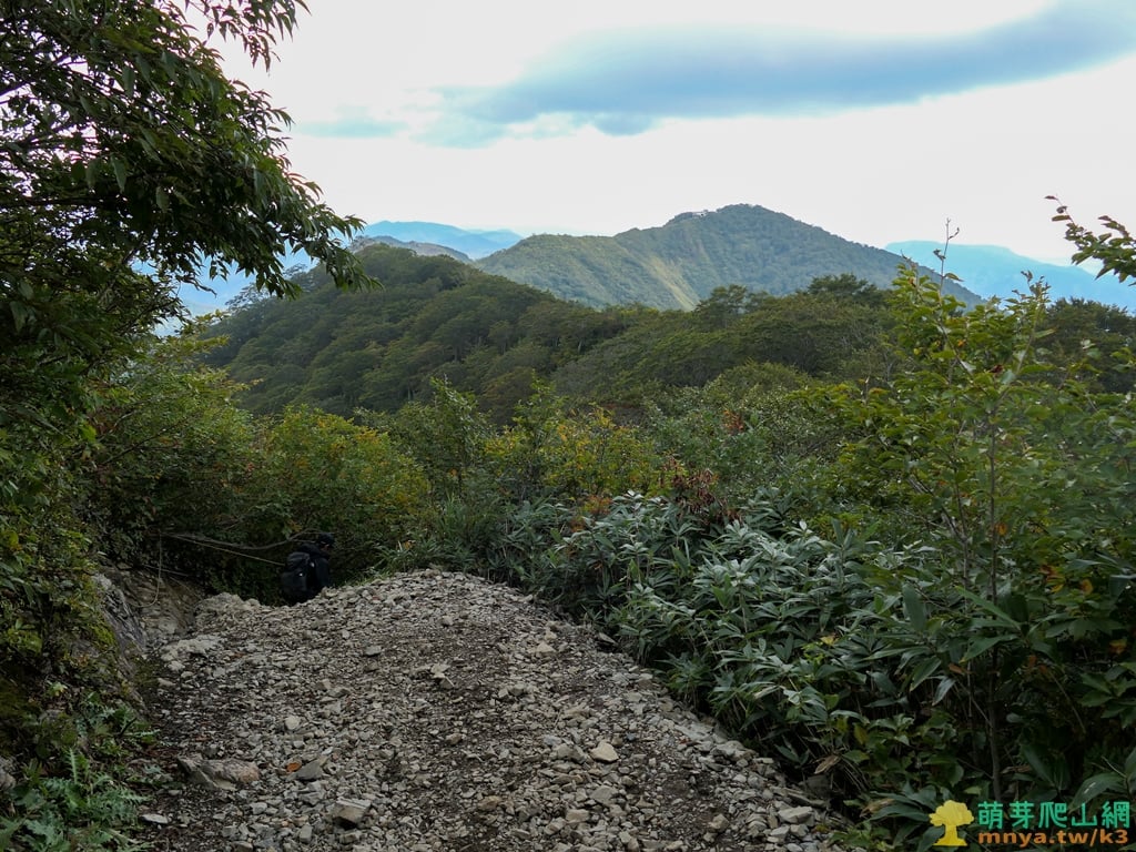 ▲陡下通過鐵鍊岩場地形後,再往前已可俯瞰最低鞍的位置,前方陡上一ノ倉岳的路徑也變得越來越近。