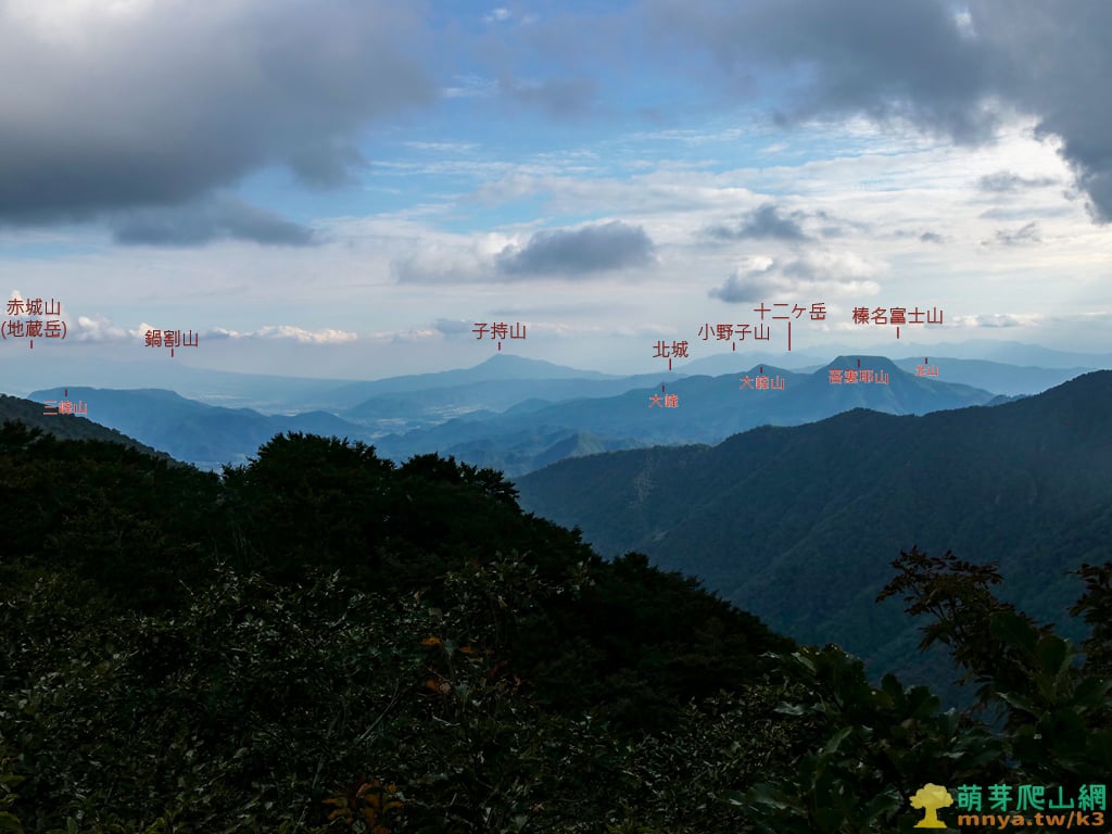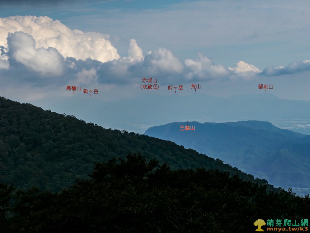 ▲天神峠右側眺望三峰山(1123M;二等三角點),其南邊對映著赤城火山群峰,從左側的赤城山最高峰 – 黒檜山(1827.67M;三等三角點),向右依序可見:駒ヶ岳 (1685M)、地蔵岳(1674M;一等三角點)、鈴ヶ岳(1565M;三等三角點)、荒山(1572M;三等三角點)、鍋割山(1332M;二等三角點)。