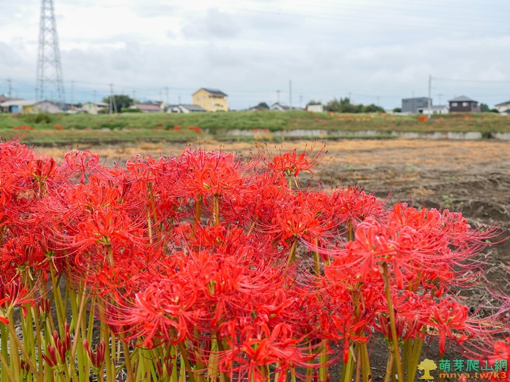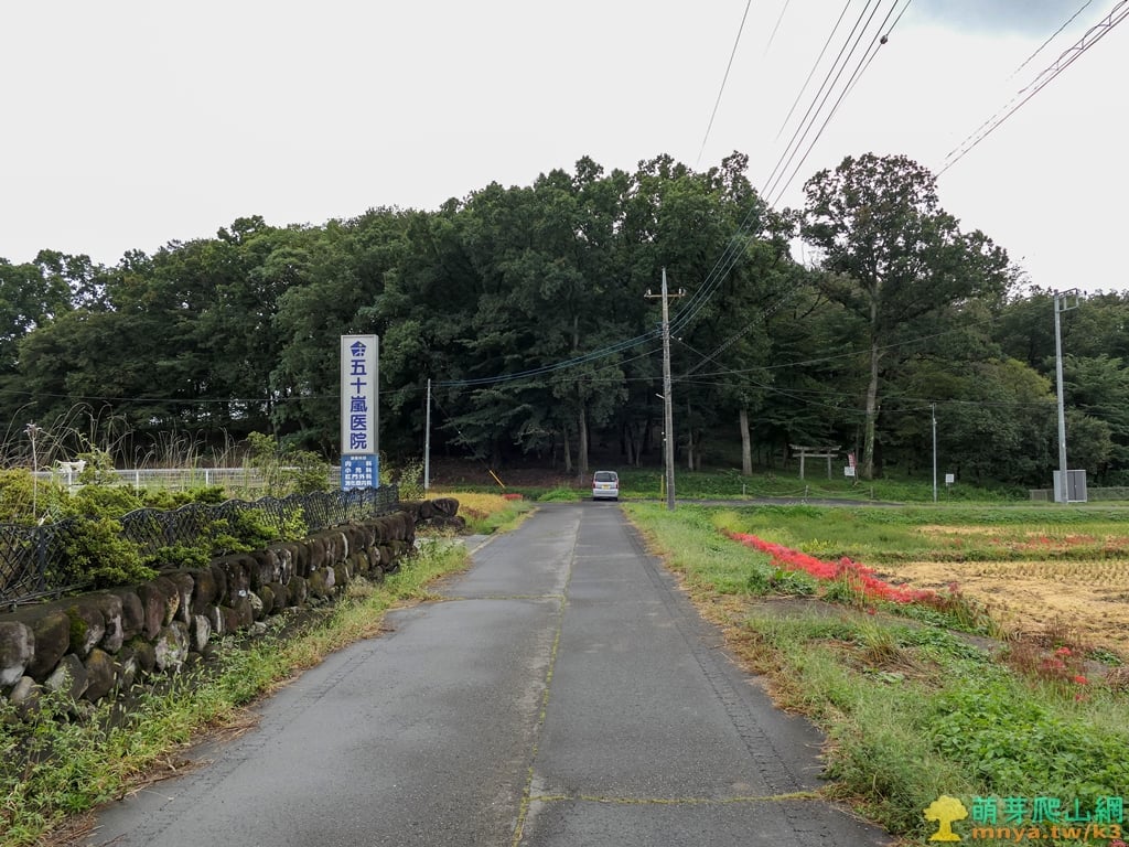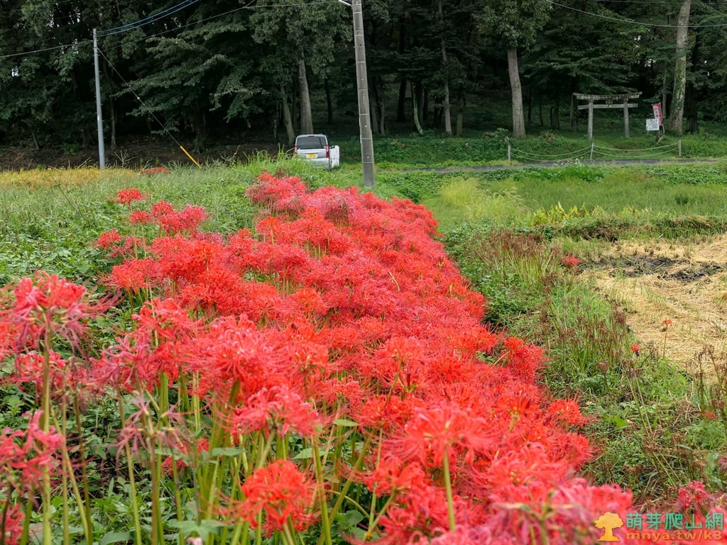 ▲從群馬県道101号(四ツ塚原之郷前橋線)轉入田間小路,過五十嵐醫院正前方T字路口空地停車,道路的正前方就是九十九山,路邊的田野間長滿了紅花石蒜(彼岸花)。