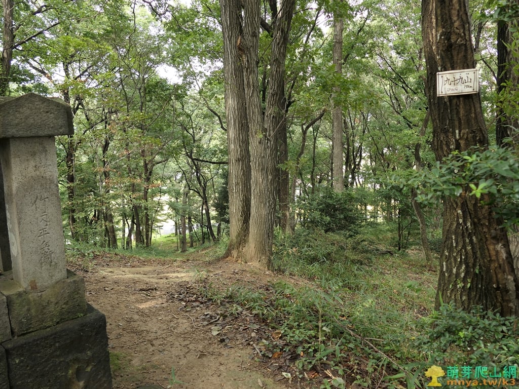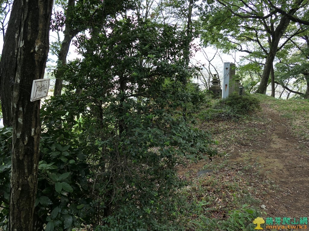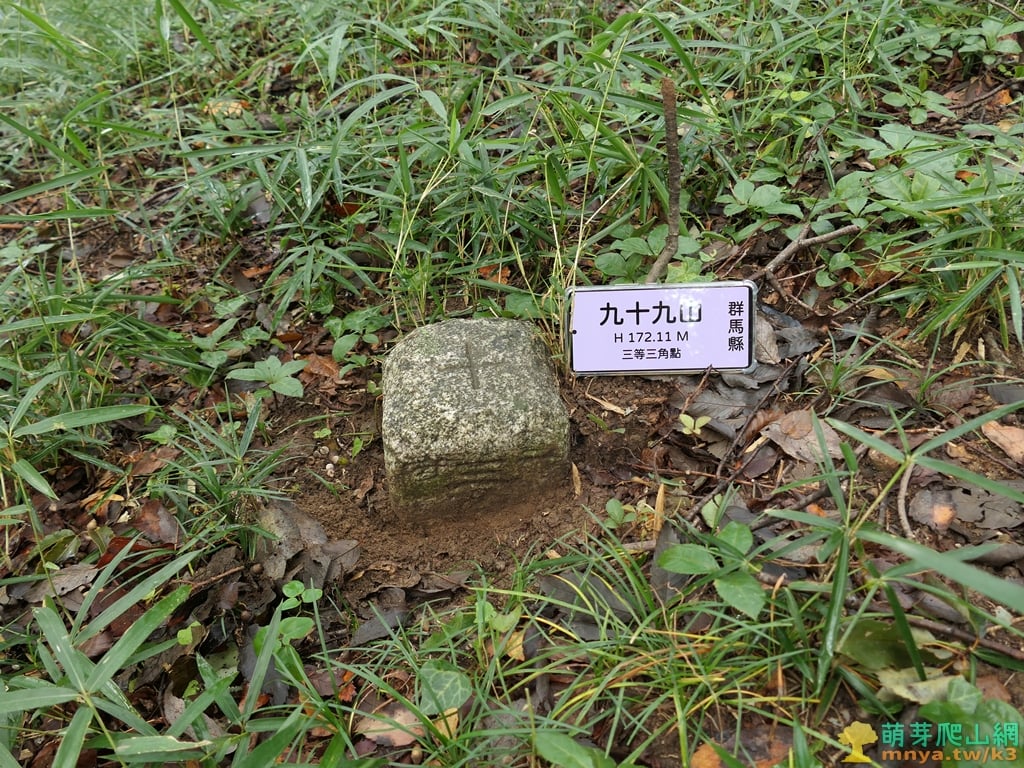 ▲「九十九山 172M」山頂牌,往後圓部側石塔方向看,石塔下是鳥居跡的礎石。