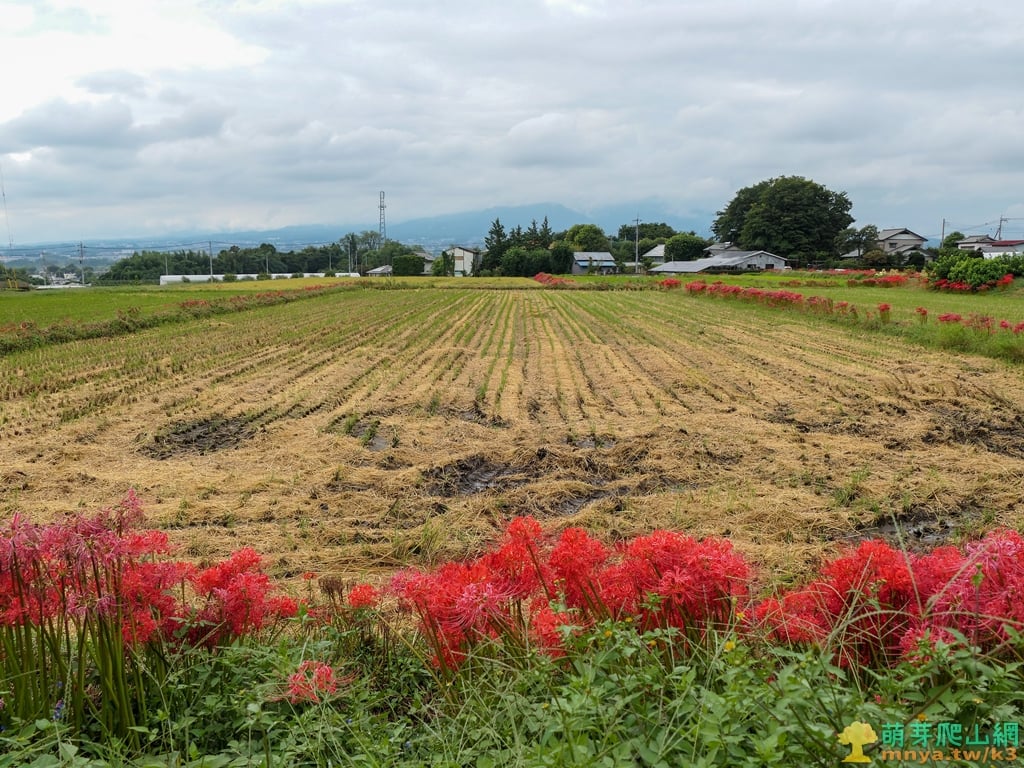 ▲九十九山週邊的稻田田埂邊種滿了紅花石蒜(彼岸花),九月~十月正是開花時節,遠方的山景對映著榛名火山群。