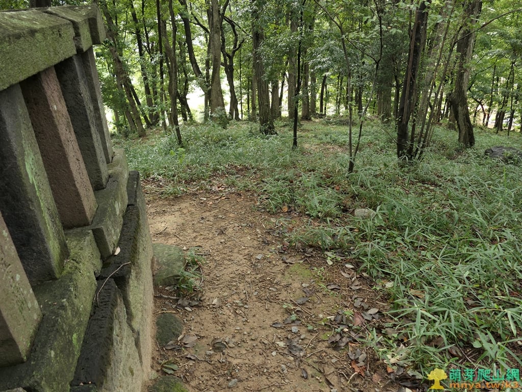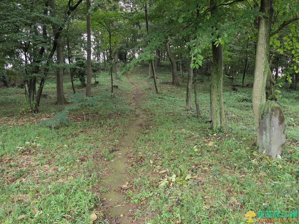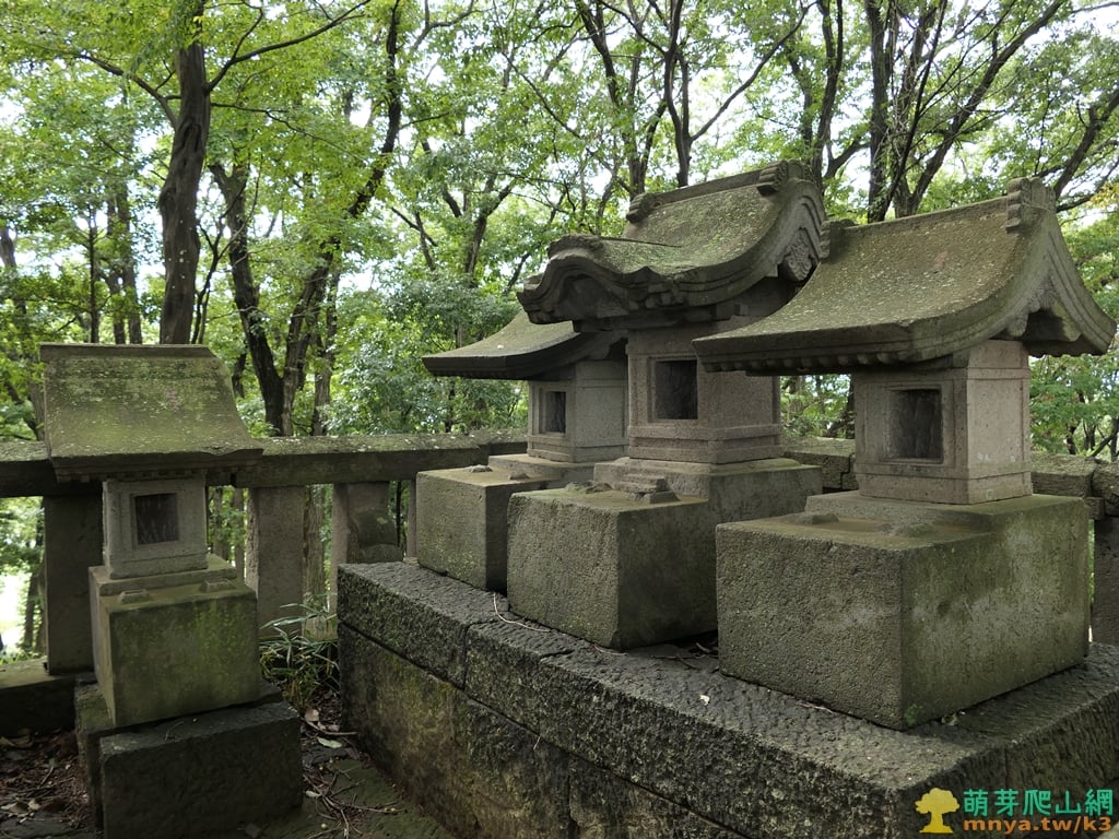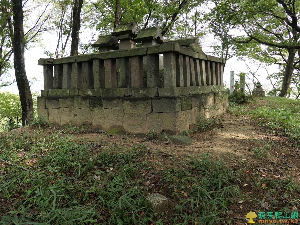 ▲於石造的八幡宮右後方,平台邊的斜坡上見到露土很低的基石,上來走約2分鐘。