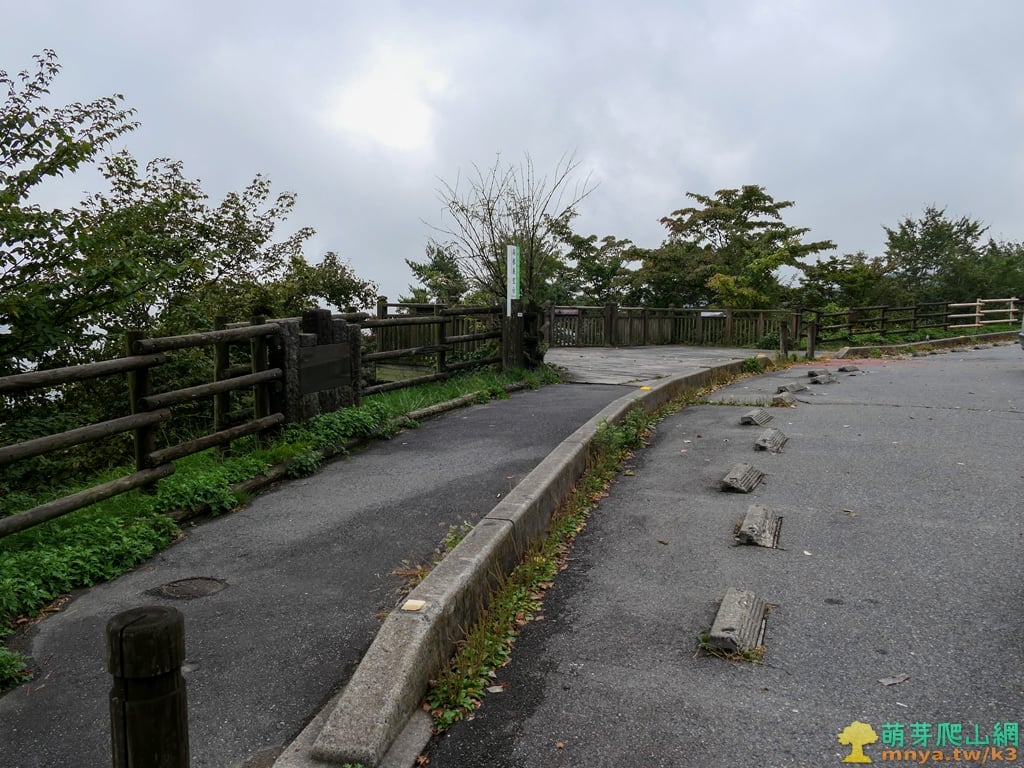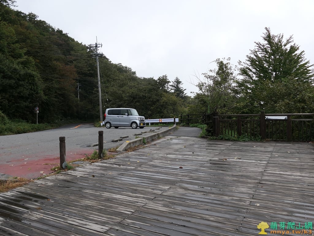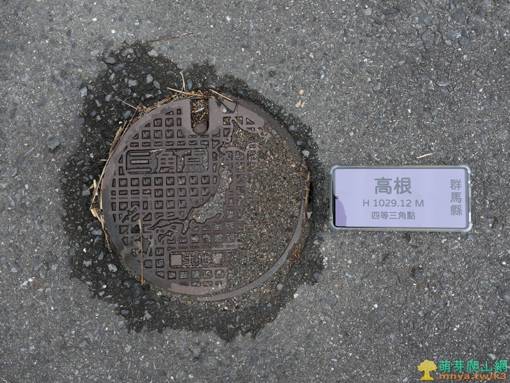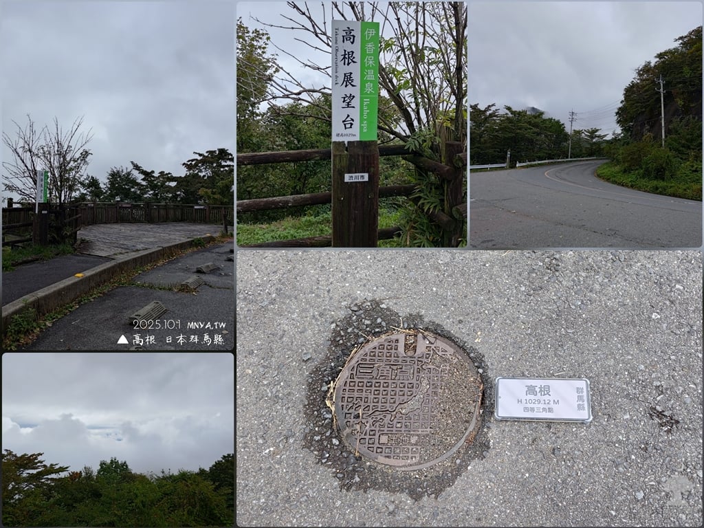 ▲從伊香保溫泉石段街沿群馬県道33号(渋川松井田線)向著榛名山前行,行約5.4K至第23個彎道處左側即「高根展望台」,"高根"四等三角點就位在停車場前的路面上,有一片国土地理院三角点的鐵板,三角點應該就在鐵板下看不到。