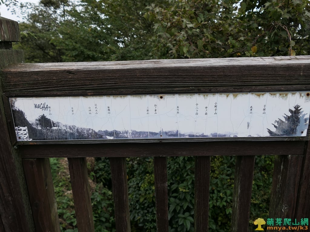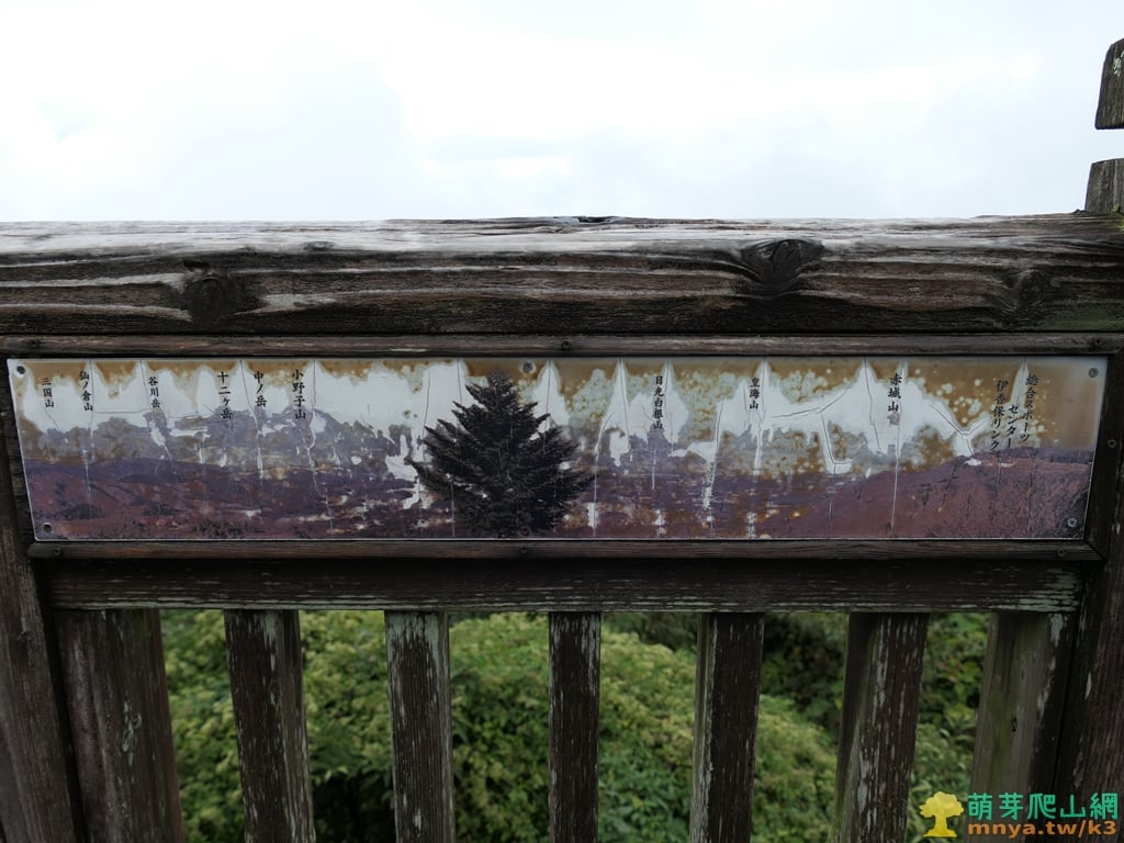 ▲高根展望台左側風景標示,圖中所示應可見:横手山(2305M;二等三角點)、岩菅山(2295M;一等三角點)、白砂山(2140M;三等三角點 西川浦)、佐武流山(2192M;二等三角點)、苗場山(2145M;一等三角點)、三国山(1636M;三等三角點)、仙ノ倉山(2026M;二等三角點 千倉山)、谷川岳(1977M)、十二ケ岳(1202M;二等三角點)、中ノ岳(1183M)、小野子山(1208M;四等三角點)、武尊山(2158M;一等三角點)、子持山(1296M;一等三角點)。