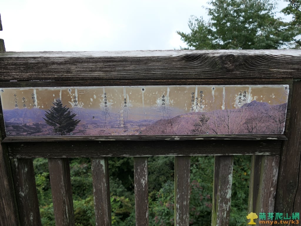 ▲高根展望台中間之左側的展望標示,圖左至右分別可見:三国山(1636M;三等三角點)、仙ノ倉山(2026M;二等三角點 千倉山)、谷川岳(1977M)、十二ケ岳(1202M;二等三角點)、中ノ岳(1183M)、小野子山(1208M;四等三角點);日光白根山(2578M;二等三角點)、皇海山(2144M;二等三角點)、赤城山(1828M;三等三角點 黒檜山)、総合スポーツセンター 伊香保リンク(綜合運動中心 伊香保溜冰場)。