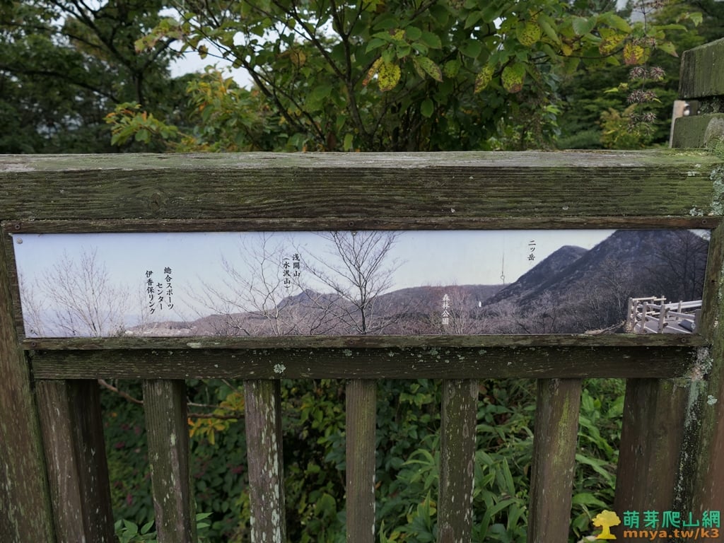 ▲高根展望台右側風景標示,圖左至右分別可見:総合スポーツセンター 伊香保リンク(綜合運動中心 伊香保溜冰場)、浅間山(水沢山;1194M;三等三角點)、森林公園、二ツ岳(1306M),二ツ岳為雙峰左右分別是雌岳(1306M)、雄岳(1340M)。