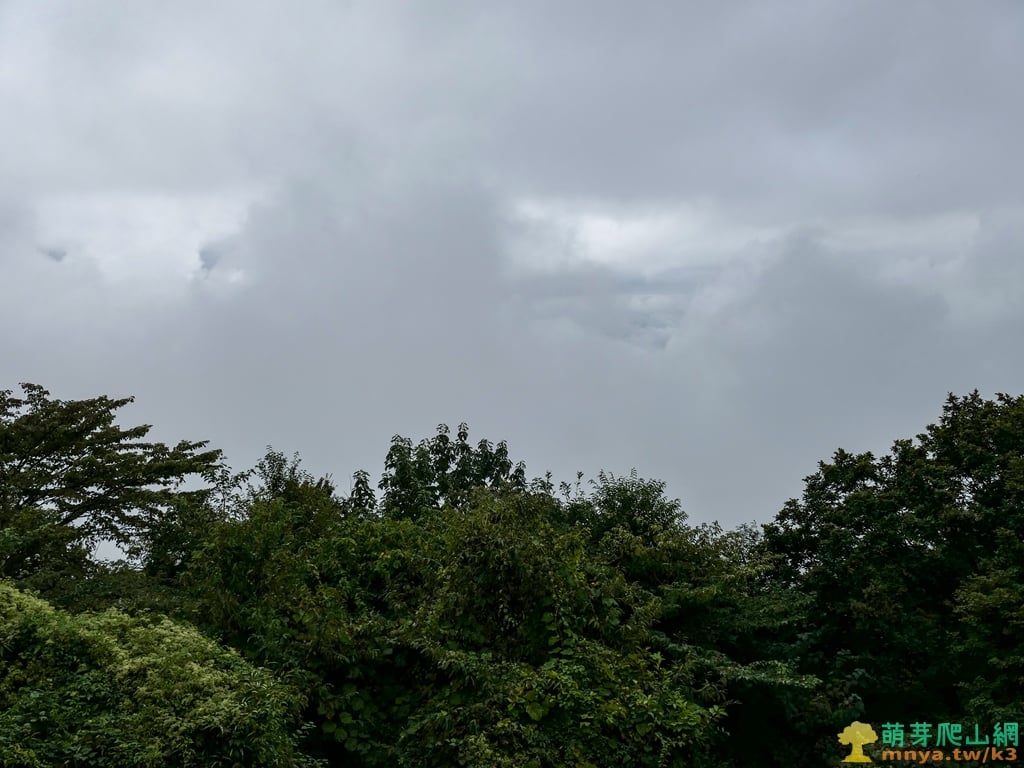▲展望台前一片白濛濛的景象,秋季的植被比較茂盛,山坡下綠蔭盎然。