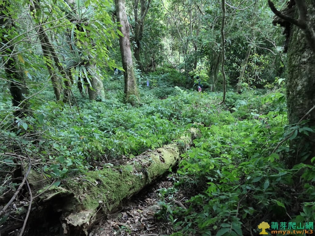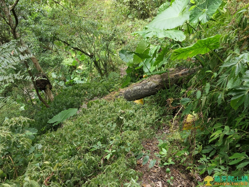 ▲繼續橫切跨越倒木,路跡不太清楚,路條也很稀疏。